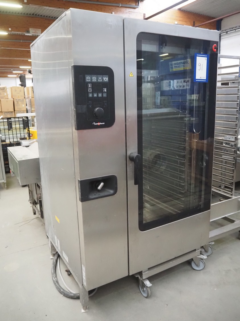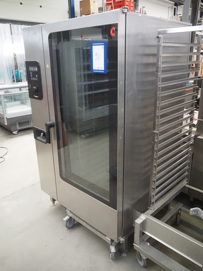 Convotherm combi steamer, type: C4eD20.20 ES, serial number: XS716051165, 400 V, 3Ph, 50/60 Hz, 67.3 kW, 97.3 A, dimensions: 1150 mm x 1100 mm x 1950 mm. Including 2 s/s trolleys, 20 floors each, dimensions floors: (20x) 650 m x 535 mm.