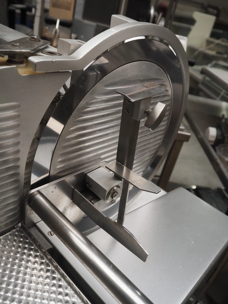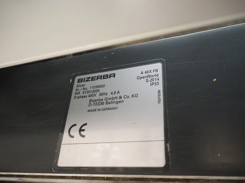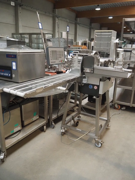 Bizerba mobile slicer, model: A 40X FB, number: 11058000, year of construction: 2014, 400 V, 3 Ph, 50 Hz, 4.8 A, s/s mesh belt, belt width: 250 mm, total dimensions: 1550 mm x 980 mm x 1480 mm.