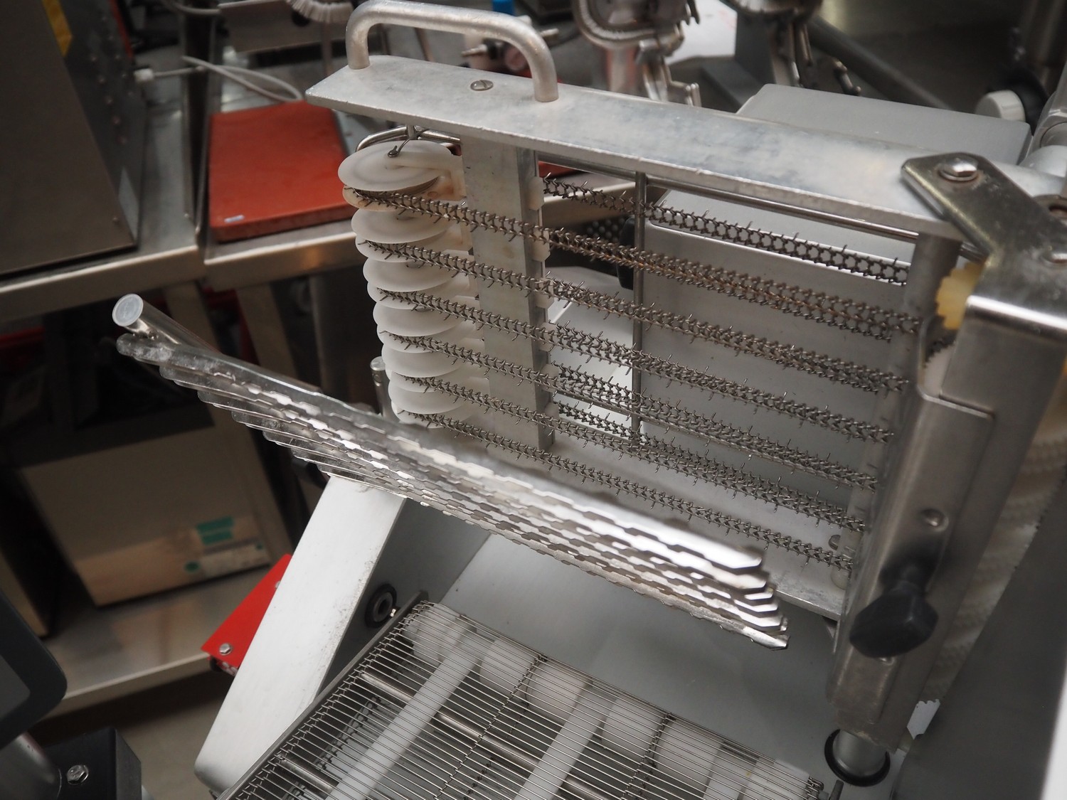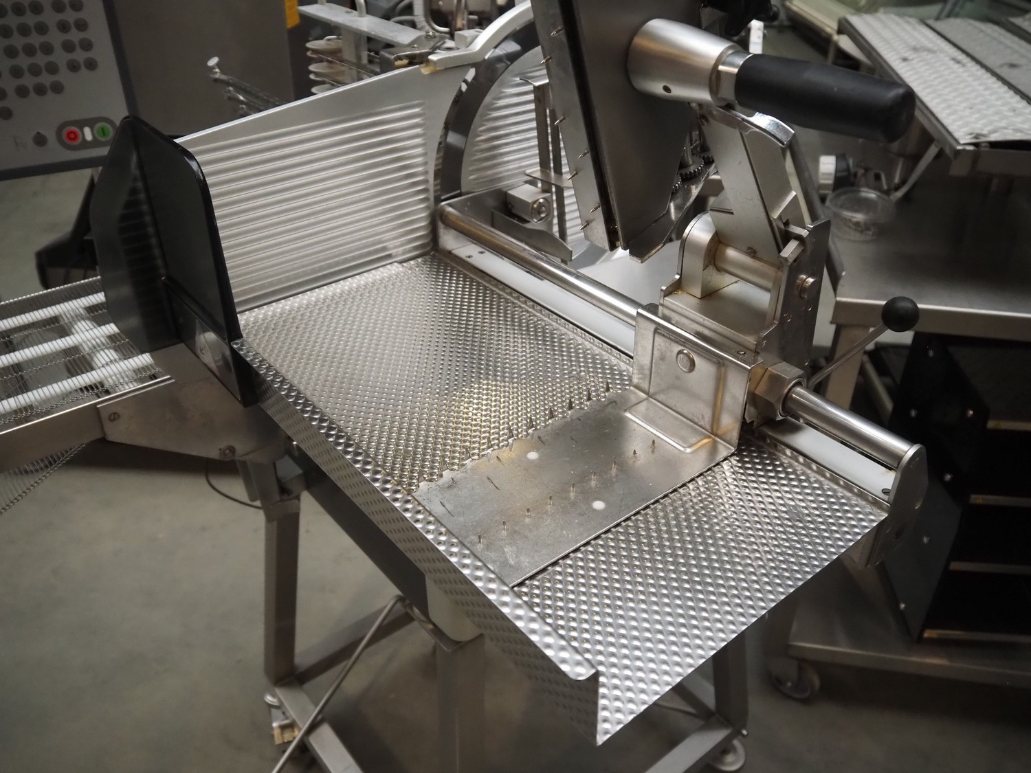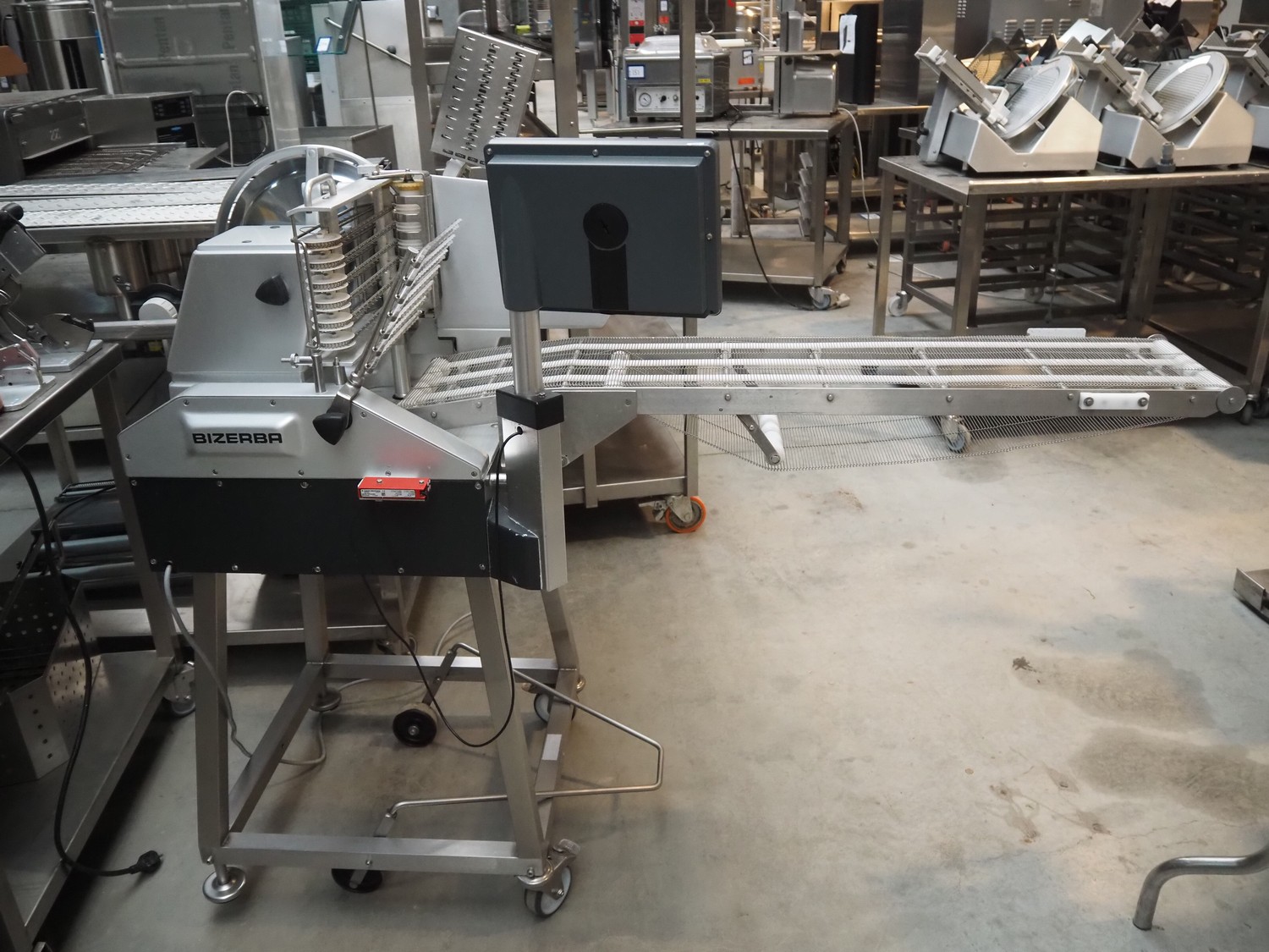 Bizerba mobile slicer, model: A 40X FB, number: 11058000, year of construction: 2014, 400 V, 3 Ph, 50 Hz, 4.8 A, s/s mesh belt, belt width: 250 mm, total dimensions: 1550 mm x 980 mm x 1480 mm.