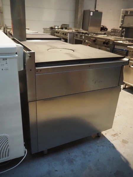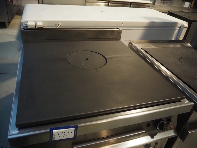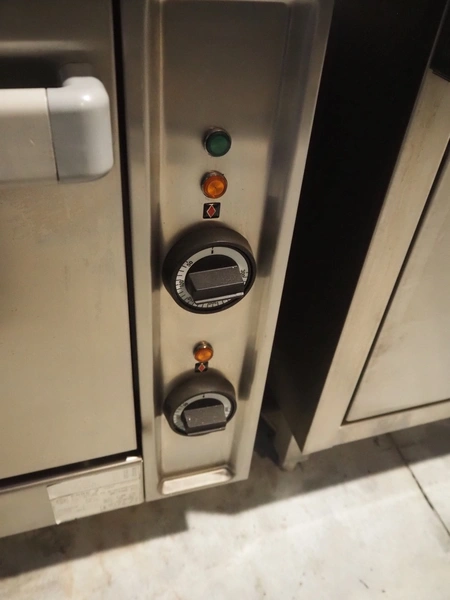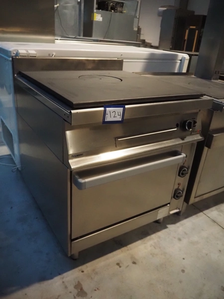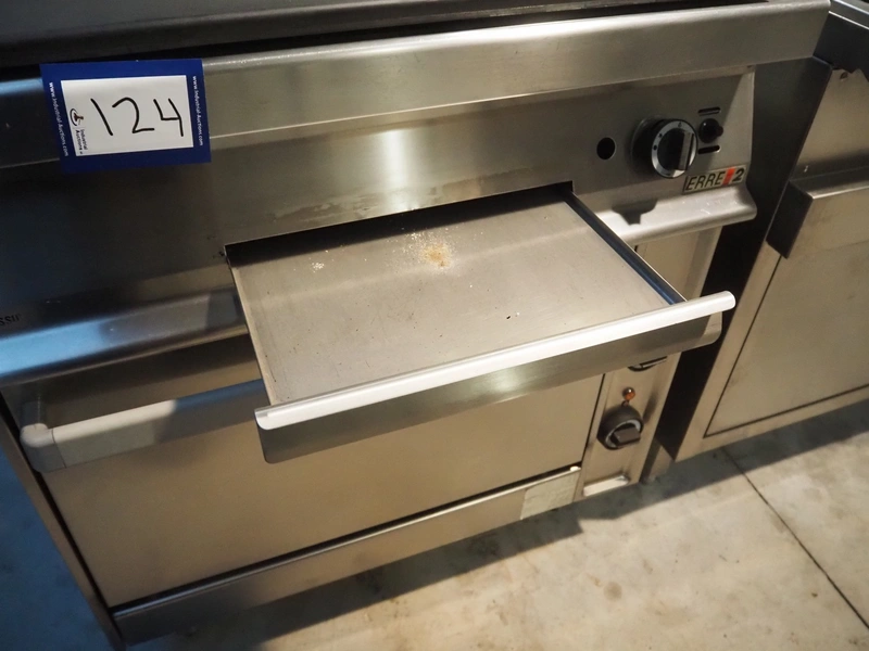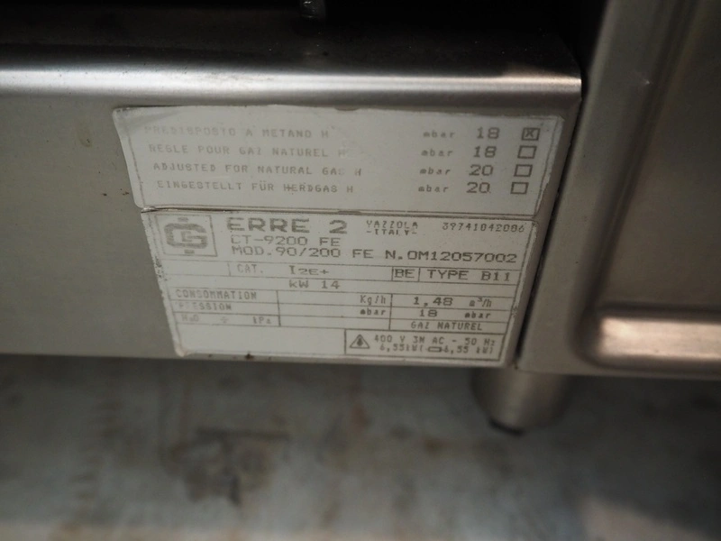 ERRE 2 srl gas stove with oven, model: 90/200 FE, number: OM12057002, 400 V, 3 Ph, 50 Hz, 6.55 kW, dimensions: 800 mm x 900 mm x 970 mm.