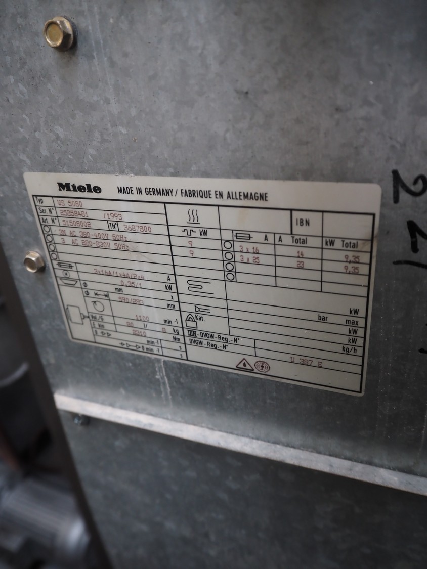 Miele washing machine, type: WS 5080, serial number: 25258481, year of construction: 1993, 220/400 V, 3 Ph, 50 Hz, 16/25 A, 9.35 kW, dimensions: 800 mm x 750 mm x 1150 mm.