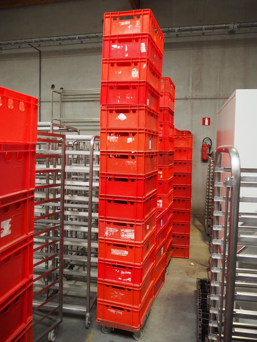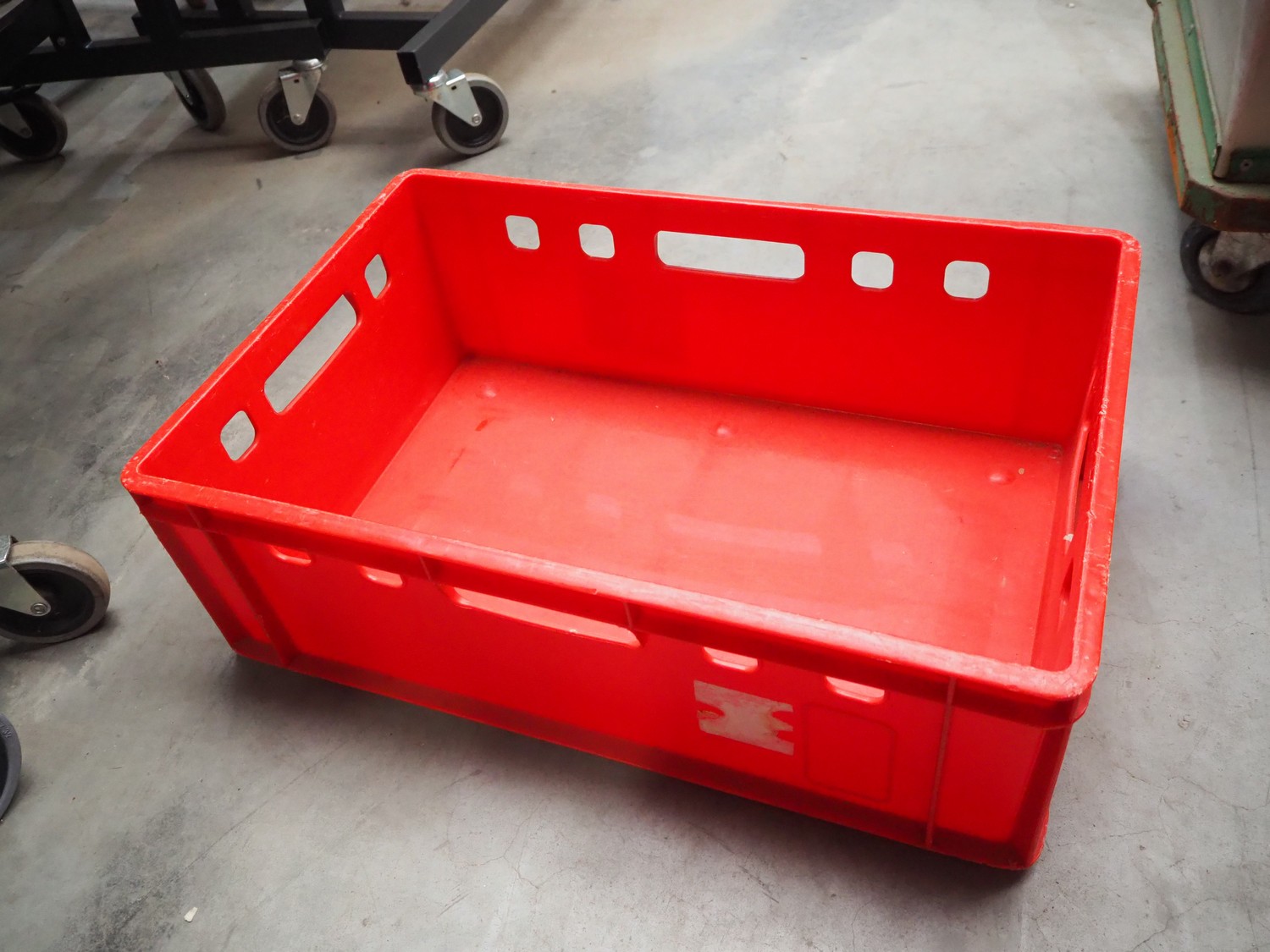 14 E-2 plastic crates on plastic rollie, dimensions (14x): 600 mm x 400 mm x 190 mm.