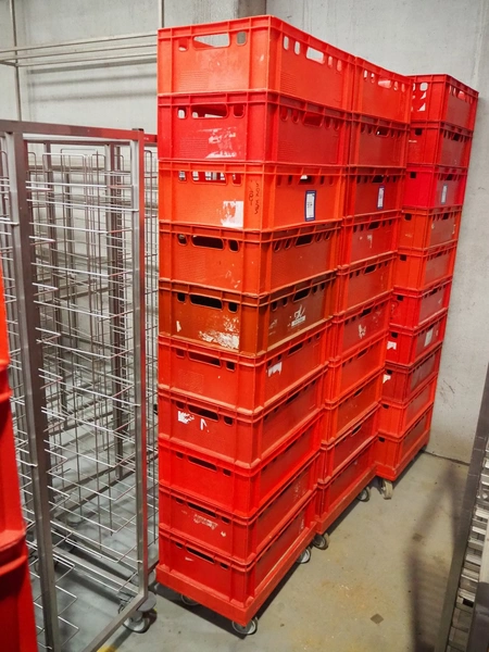 10 E-2 plastic crates on plastic rollie, dimensions (10x): 600 mm x 400 mm x 190 mm.