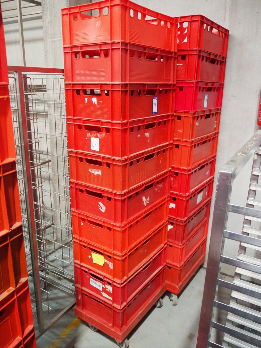 10 E-2 plastic crates on plastic rollie, dimensions (10x): 600 mm x 400 mm x 190 mm.