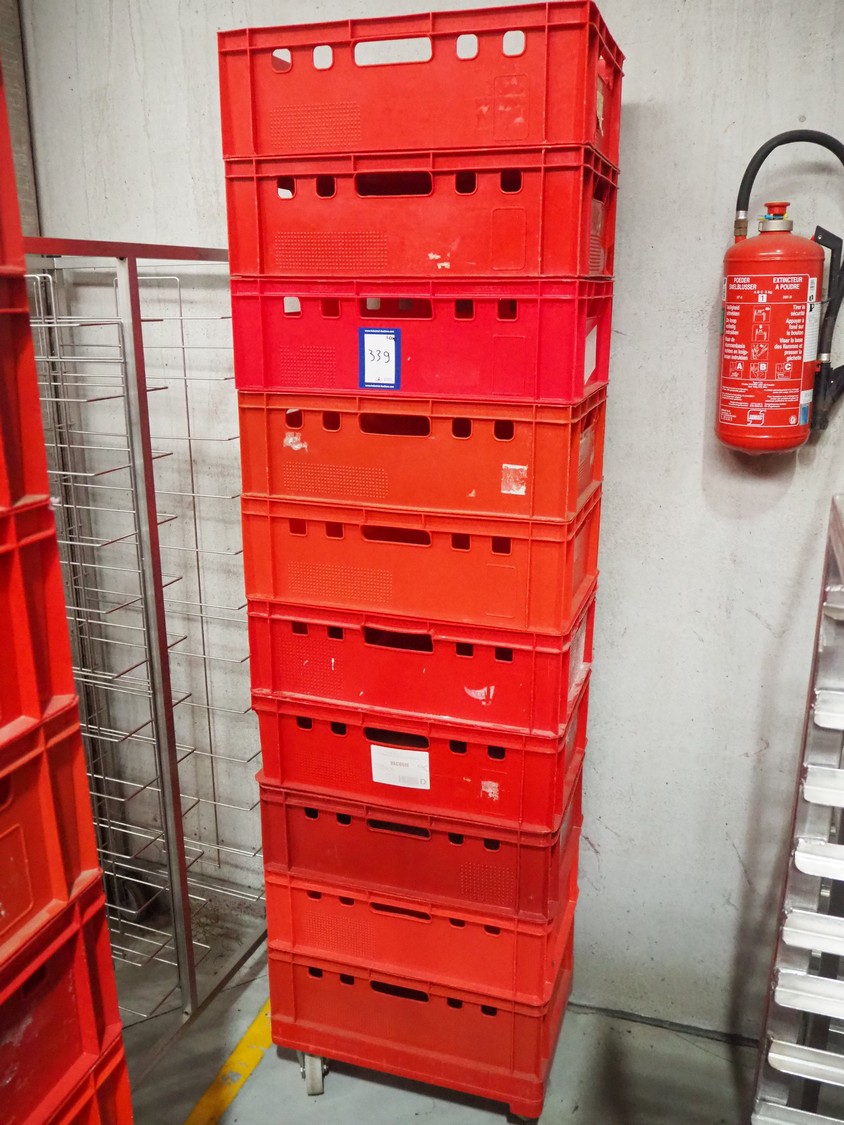 10 E-2 plastic crates on plastic rollie, dimensions (10x): 600 mm x 400 mm x 190 mm.
