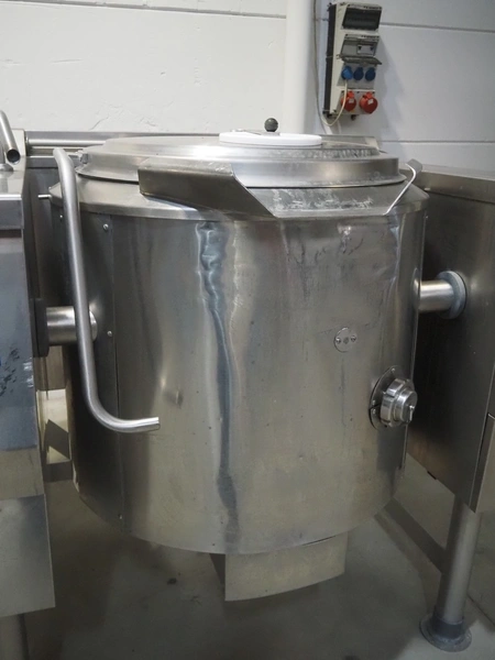 Firex tiltable braising pan with agitator and scrapers, model: PRIV180M, number: 30 LL 18735, year of construction: 2007, volume: 180 liter, total dimensions: 1450 mm x 1350 mm x 1285 mm.