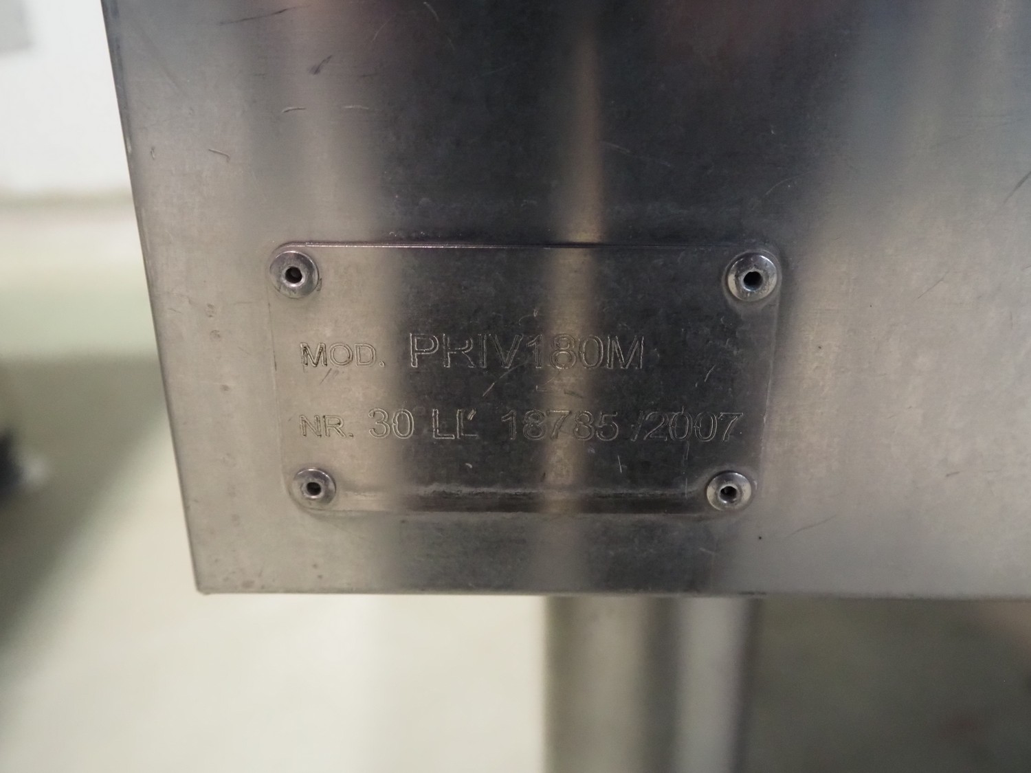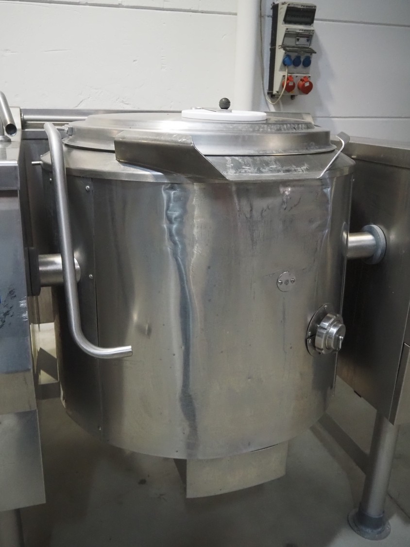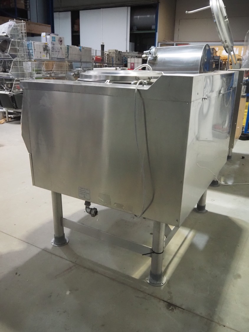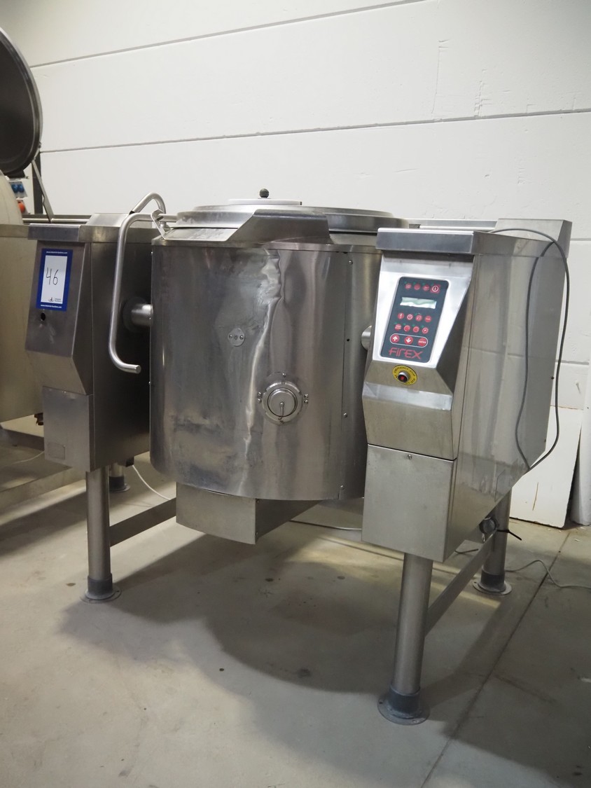 Firex tiltable braising pan with agitator and scrapers, model: PRIV180M, number: 30 LL 18735, year of construction: 2007, volume: 180 liter, total dimensions: 1450 mm x 1350 mm x 1285 mm.