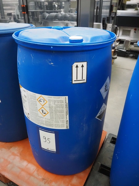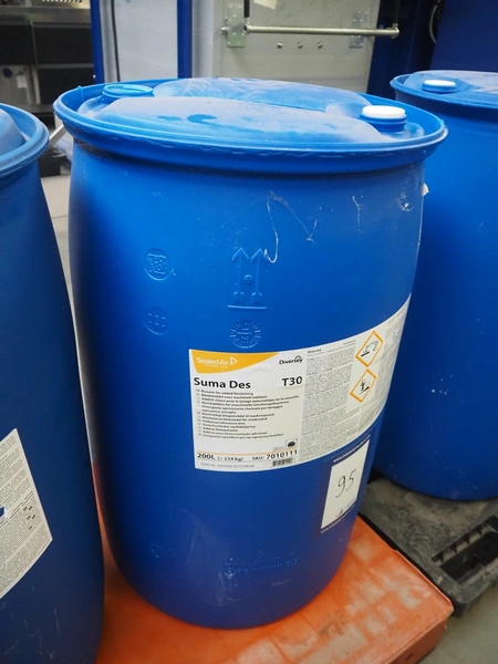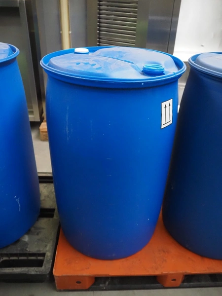 Rösler plastic barrel with bleaching agent, volume: 200 liter, dimensions: ø 585 mm x 950 mm.