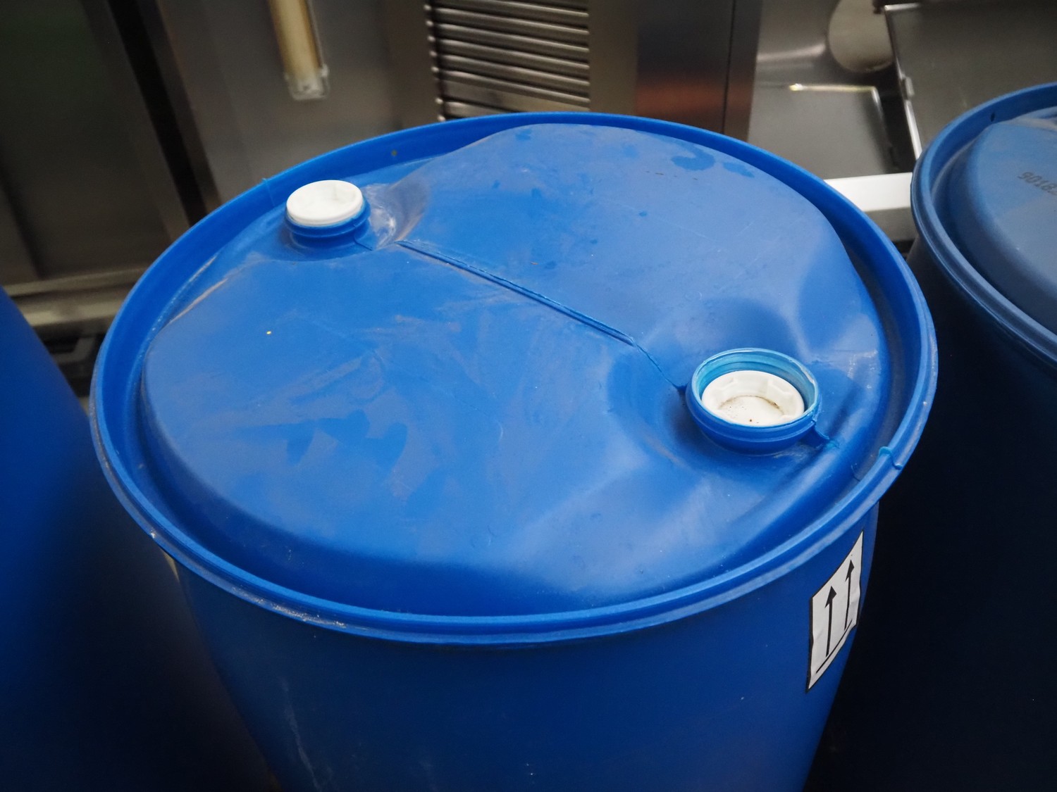 Rösler plastic barrel with bleaching agent, volume: 200 liter, dimensions: ø 585 mm x 950 mm.
