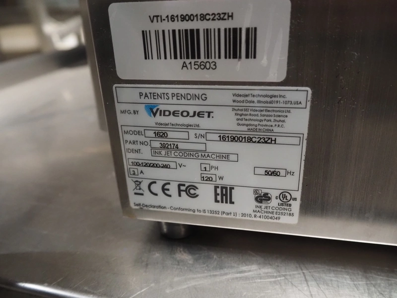 Videojet inkjet printer, model: 1620, serial number: 16190018C23ZH, 100-120/200-240 V, 1 PH, 50/60 Hz, 3 A, 120 W, dimensions: 450 mm x 350 mm x 850 mm.