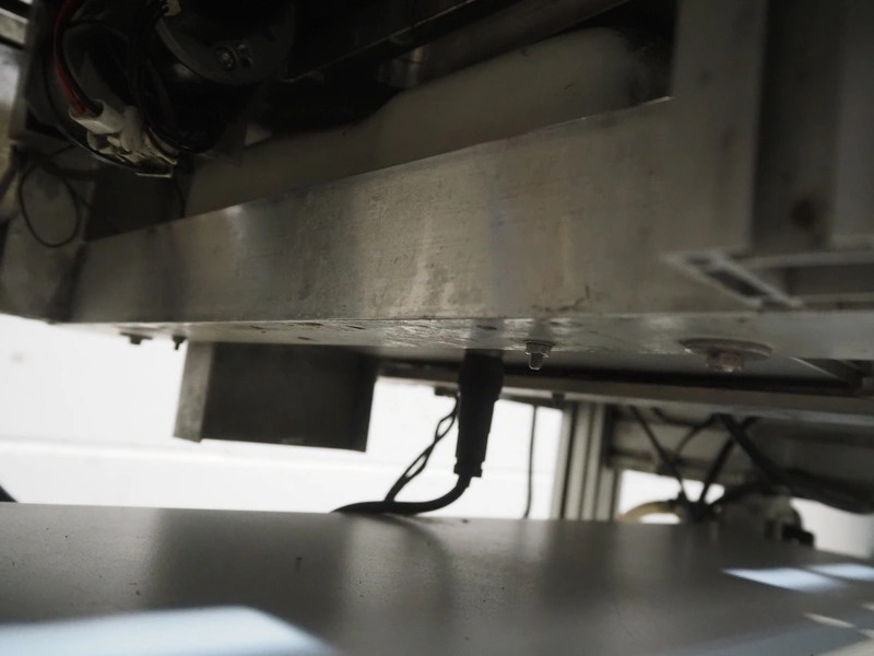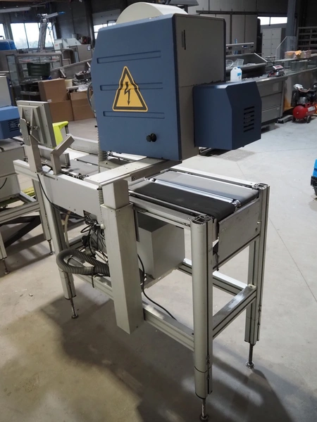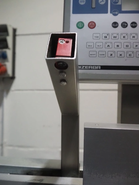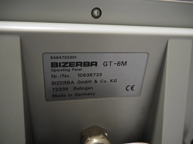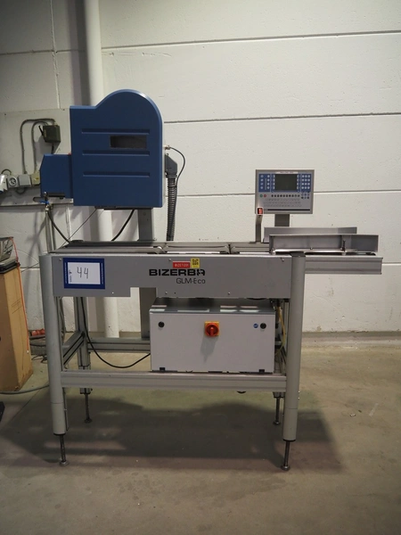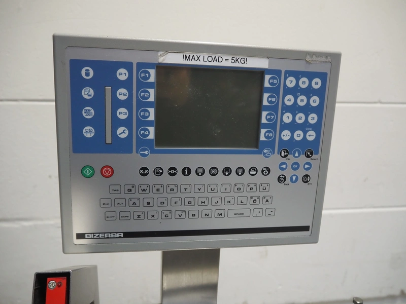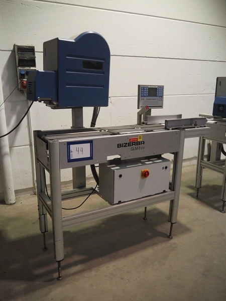 Bizerba checkweigher with labeller, model: GLM-E, number: 10743651, plastic belt, belt width: 296 mm and (2x) 135 mm, max: 6 kg, min: 20 gram, e=1 gram, total dimensions: 1630 mm x 650 mm x 1850 mm.