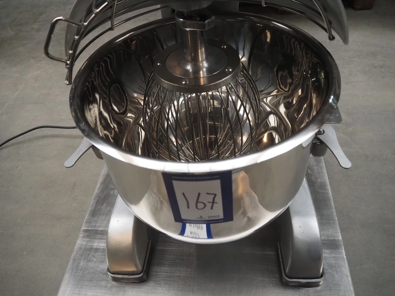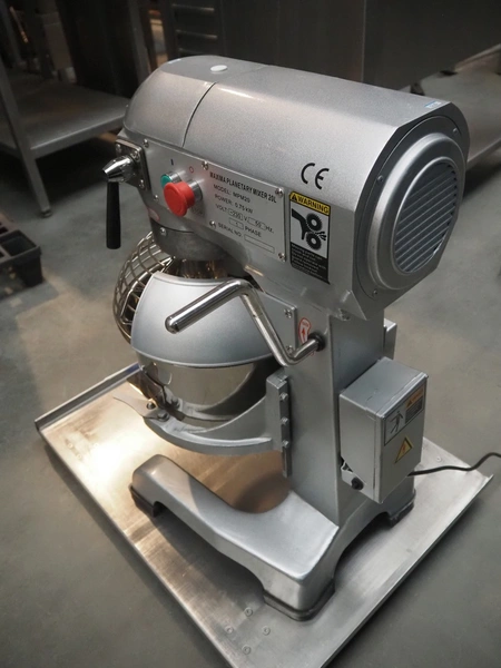 Maxima planetary mixer, model: MPM20, serial number: MPM20 Y20 2019, 230 V, 1 Ph, 50 Hz, 0.75 kW, volume: 20 liter, dimensions: 530 mm x 450 mm x 800 mm. Including flat beater and hook.