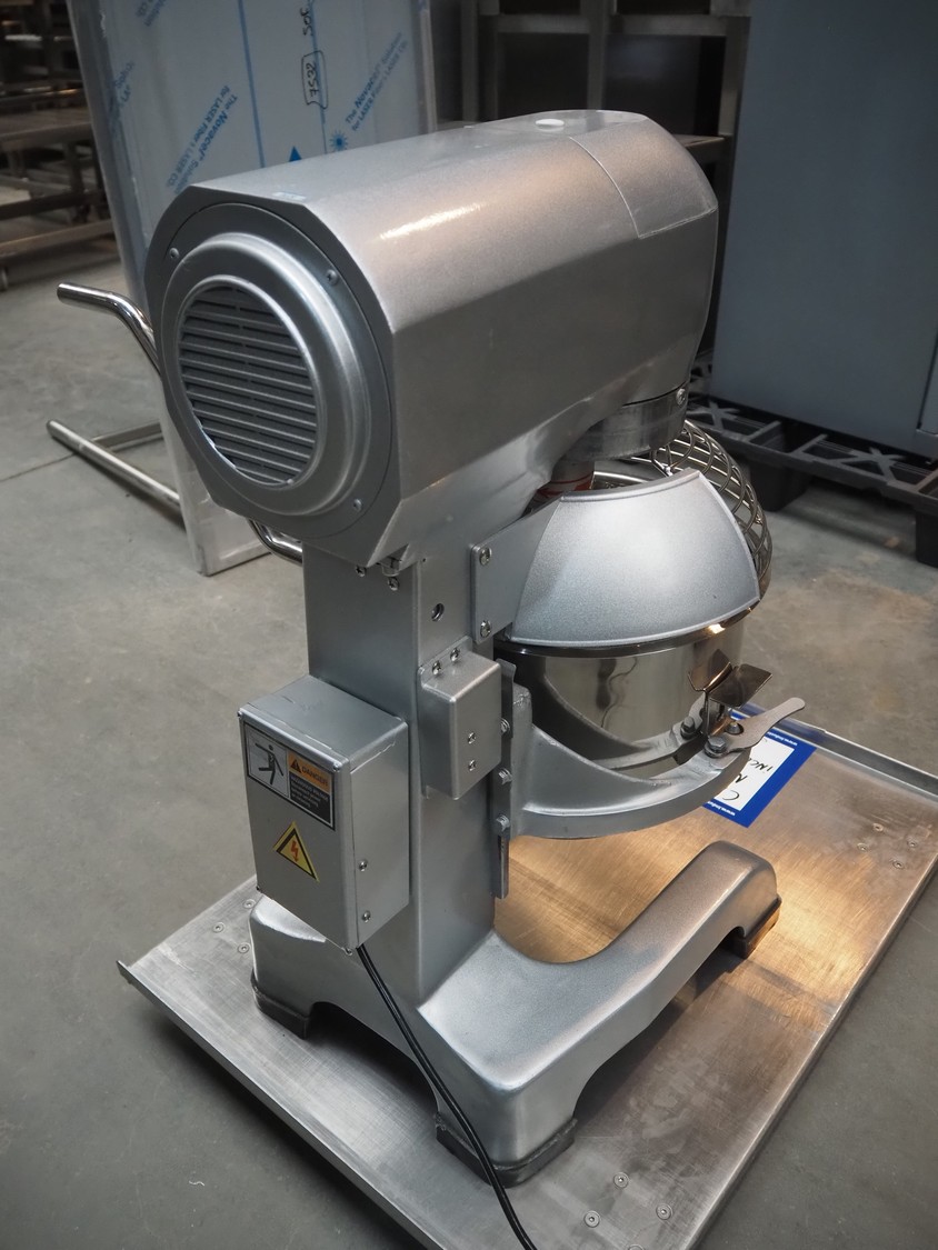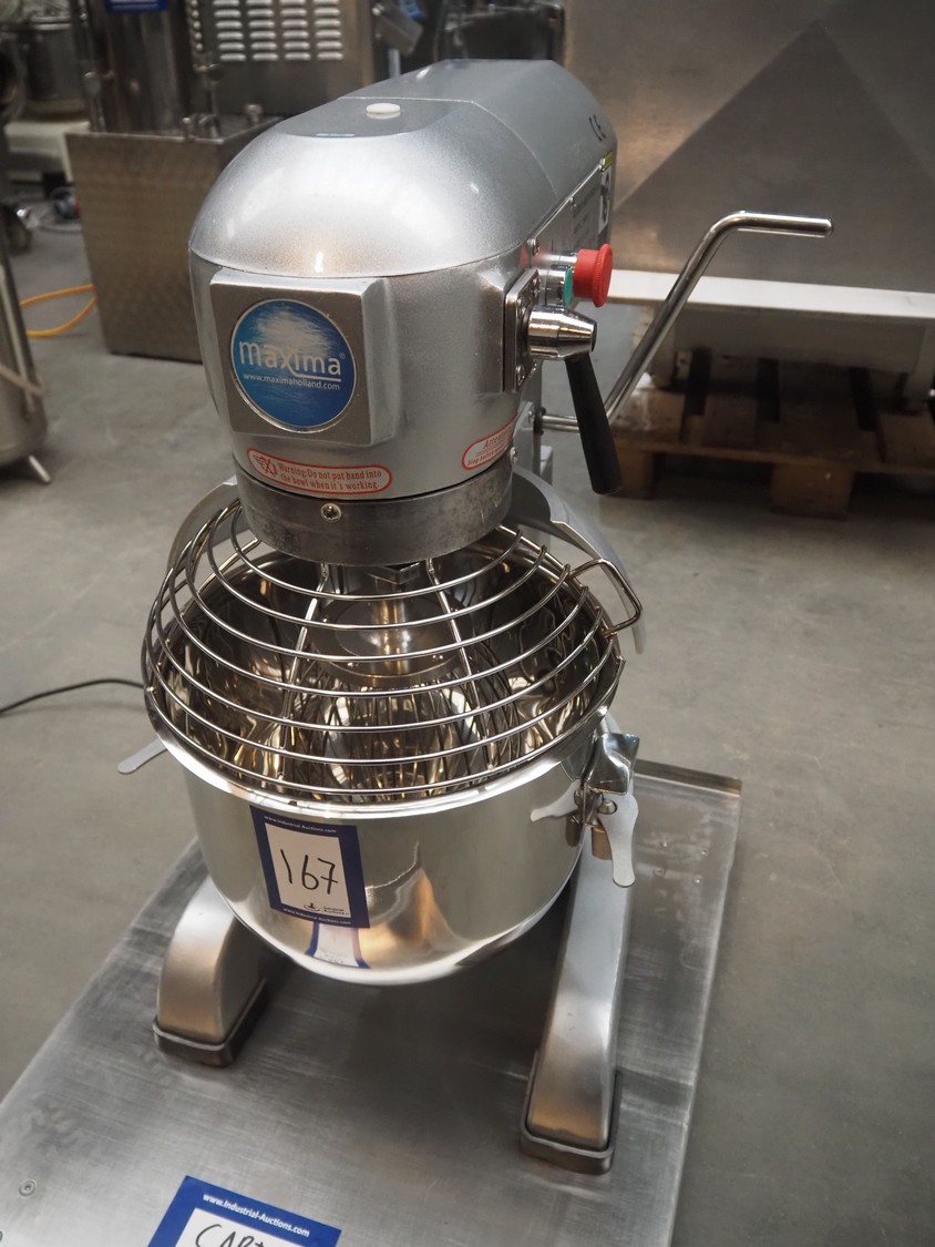 Maxima planetary mixer, model: MPM20, serial number: MPM20 Y20 2019, 230 V, 1 Ph, 50 Hz, 0.75 kW, volume: 20 liter, dimensions: 530 mm x 450 mm x 800 mm. Including flat beater and hook.