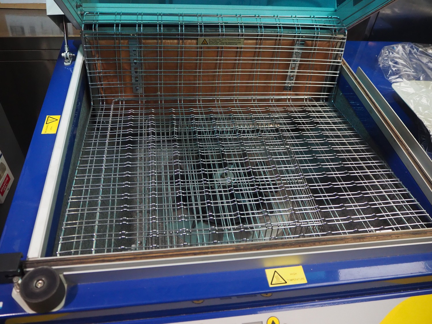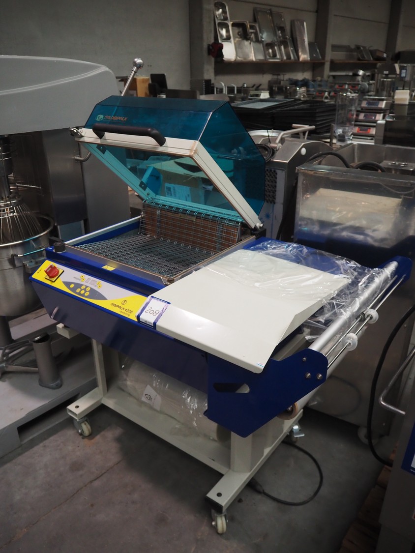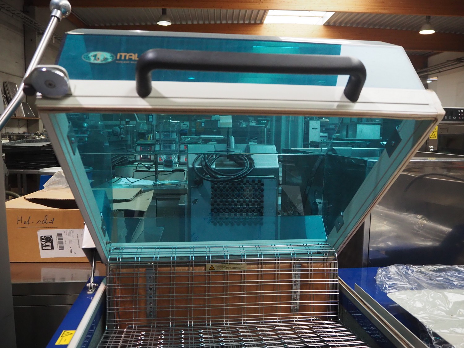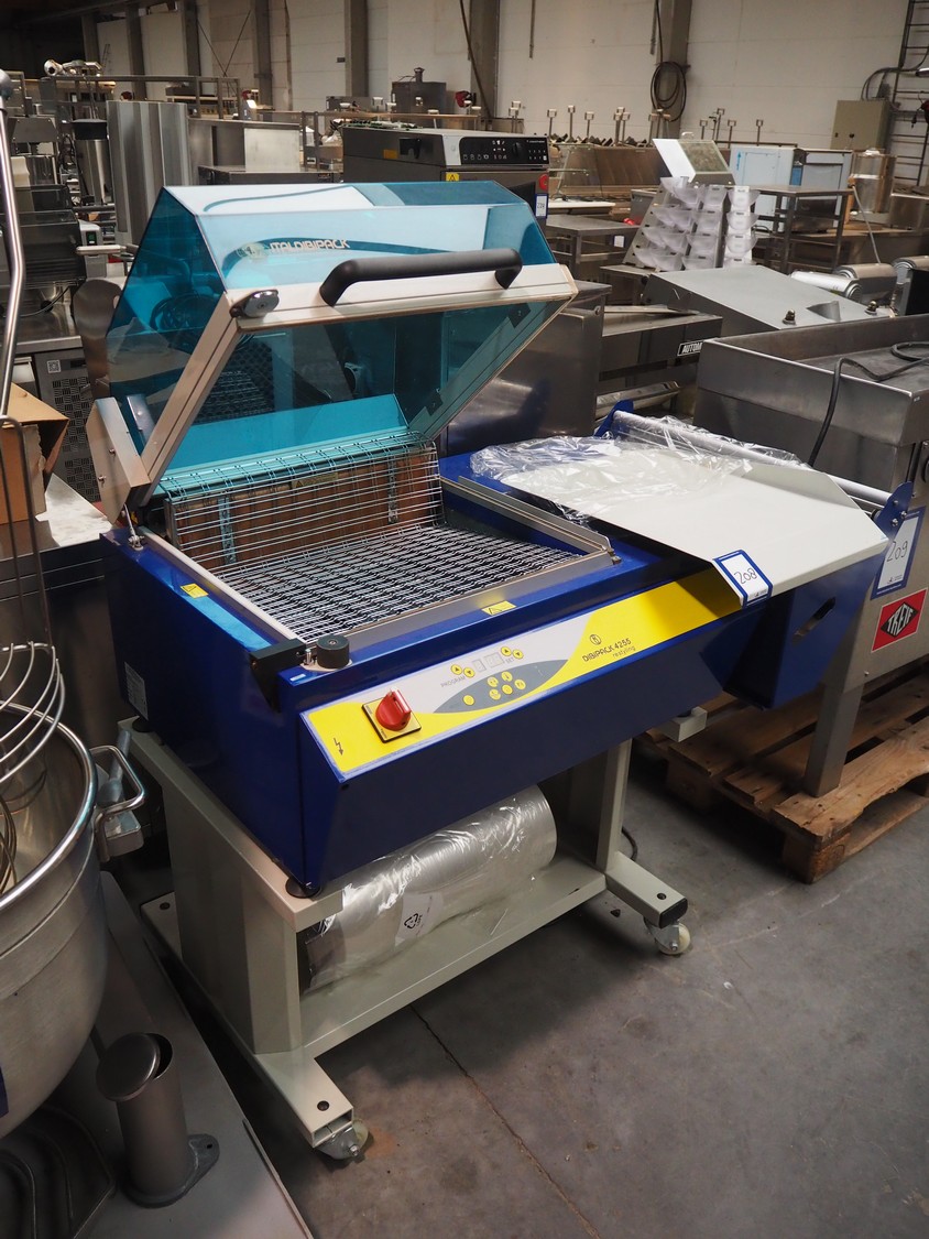 Italdibipack S.p.A. mobile heat-shrinking L-sealer system, model: Dibipack 4255EVX restyling, serial number: 022634, year of construction 2021, 230 V, 50/60 Hz, 3.5 kW, weight: 90 Kg, film width: 515 mm, seal length: 570 mm x 440 mm, total dimensions: 800 mm x 1300 mm x 1500 mm. Including 2 extra film rolls.