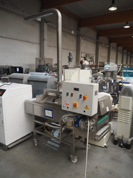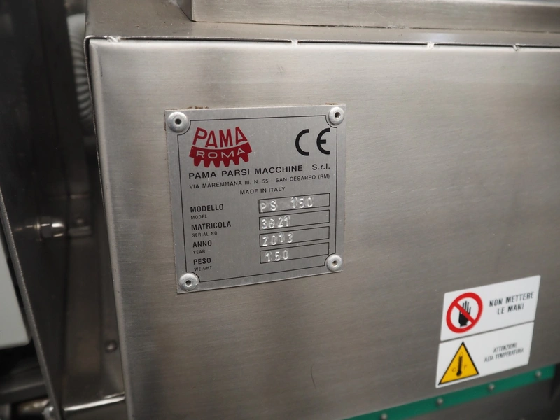 Pama Parsi Machine S.r.l. mobile pasteurizer, model: PS 150, serial number: 3621, year of construction: 2013, 400 V, 3 Ph, 50 Hz, 14 A, 9 kW, weight: 150 kg, s/s mesh belt, belt width: 400 mm, total dimensions: 1580 mm x 850 mm x 2450 mm.