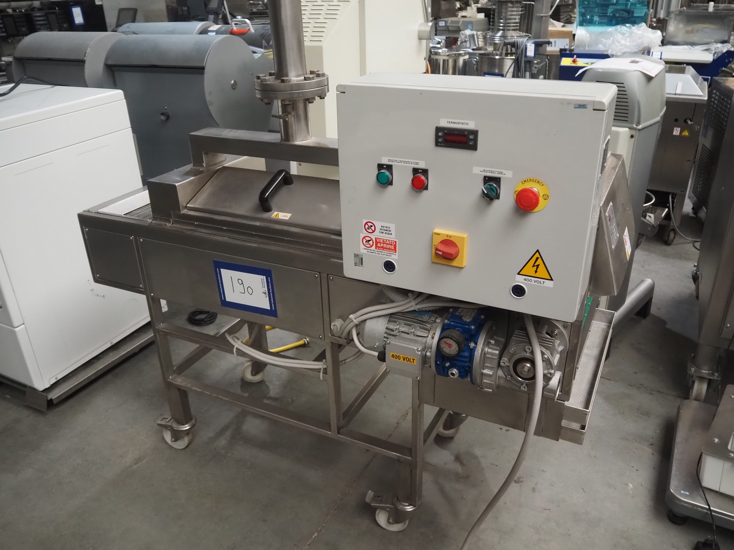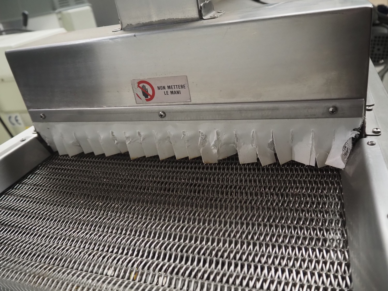 Pama Parsi Machine S.r.l. mobile pasteurizer, model: PS 150, serial number: 3621, year of construction: 2013, 400 V, 3 Ph, 50 Hz, 14 A, 9 kW, weight: 150 kg, s/s mesh belt, belt width: 400 mm, total dimensions: 1580 mm x 850 mm x 2450 mm.