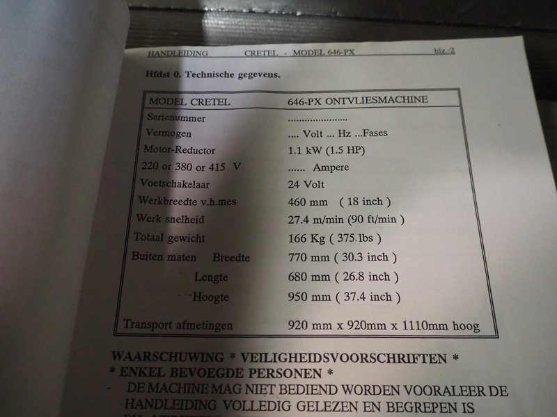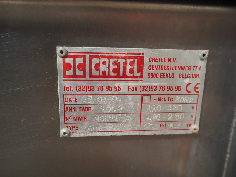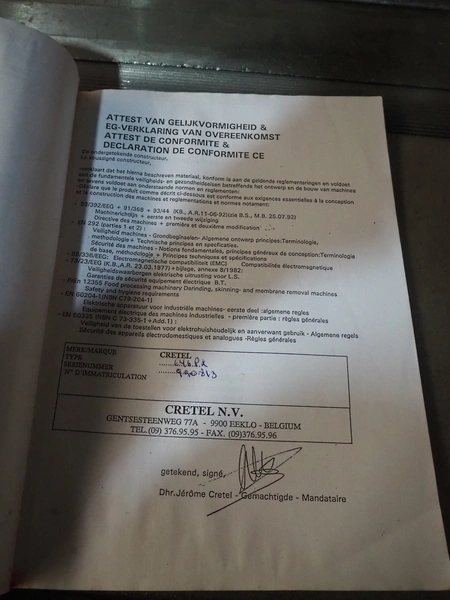 Cretel mobile skinning machine, type: 646 PX, number: 2041159, year of construction: 2004, 220/380 V, 50 Hz, 4.8/2.8 A, 1.1 kW, working width: 437 mm, total dimensions: 820 mm x 700 mm x 950 mm.