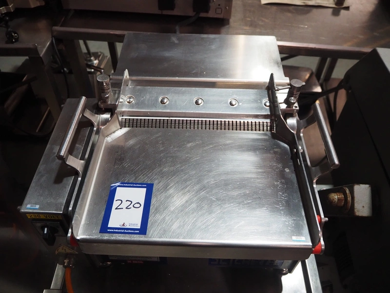 Cretel skinning machine on s/s trolley with foot control, type: 362 RK, number: 16090806, year of construction: 2006, 220/400 V, 3 Ph, 50 Hz, 3.8/2.4 A, 0.75 kW, working width: 315 mm, total dimensions: 620 mm x 605 mm x 1050 mm.