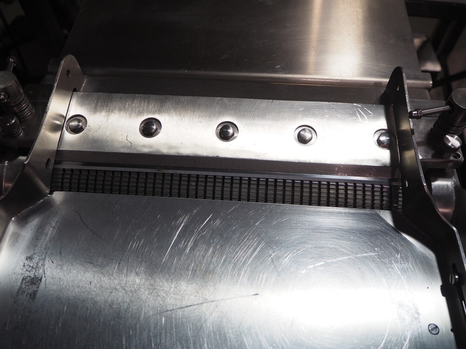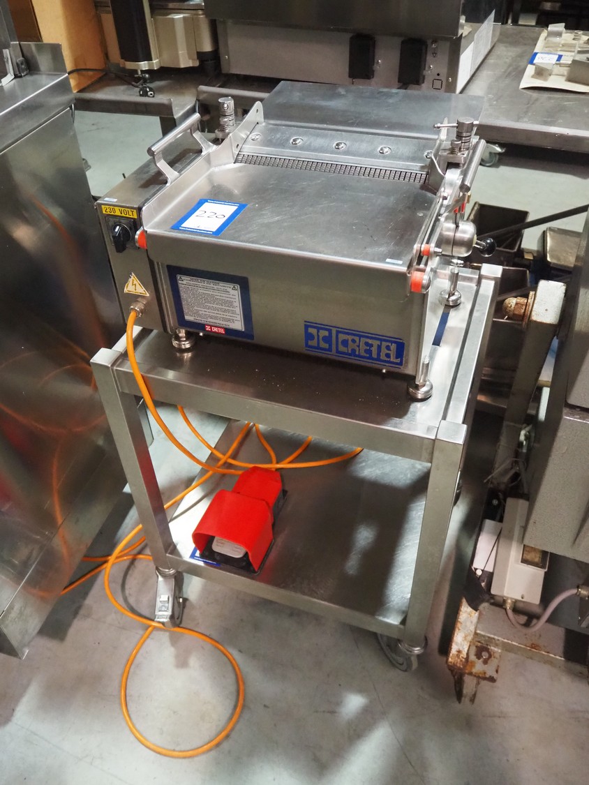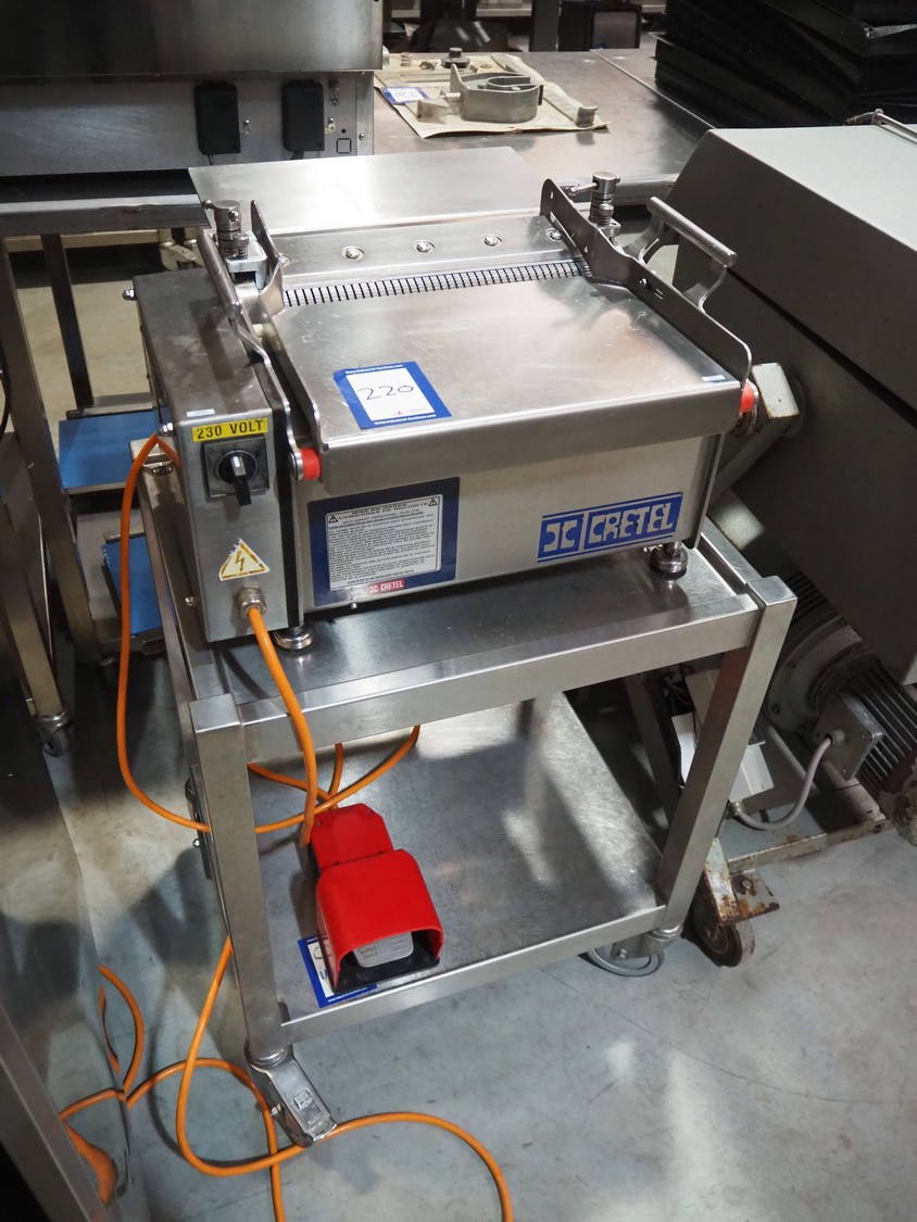 Cretel skinning machine on s/s trolley with foot control, type: 362 RK, number: 16090806, year of construction: 2006, 220/400 V, 3 Ph, 50 Hz, 3.8/2.4 A, 0.75 kW, working width: 315 mm, total dimensions: 620 mm x 605 mm x 1050 mm.