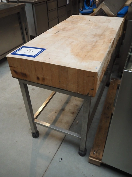 Wooden chop block, s/s frame, dimensions: 1200 mm x 600 mm x 880 mm.
