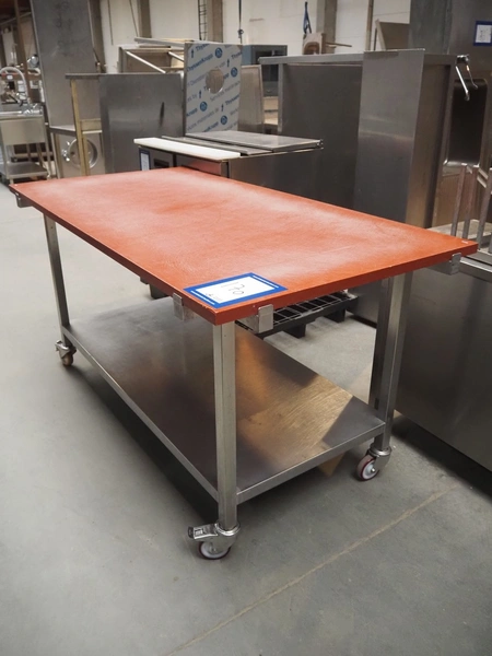Mobile s/s table with plastic work top, dimensions: 1800 mm x 900 mm x 900 mm.