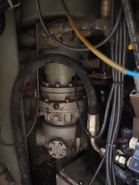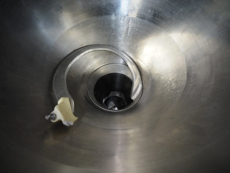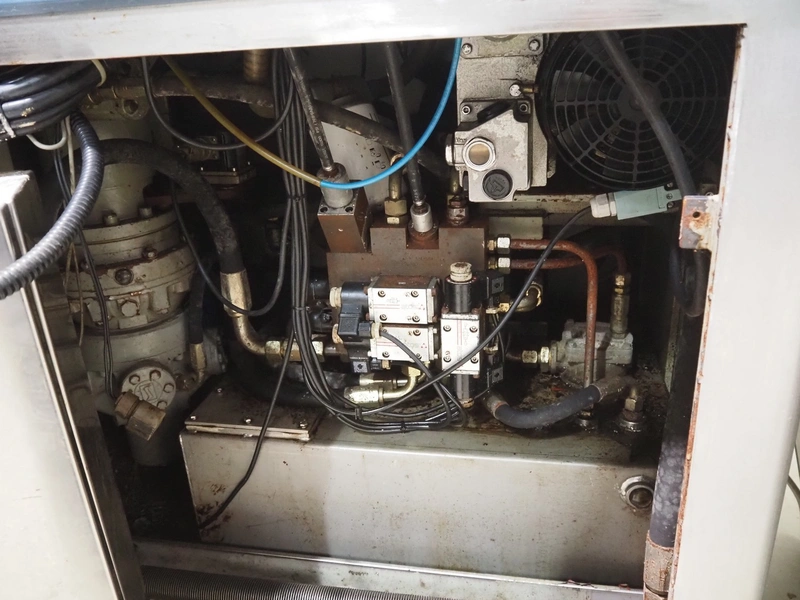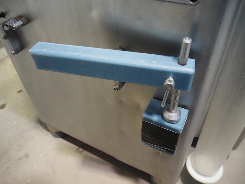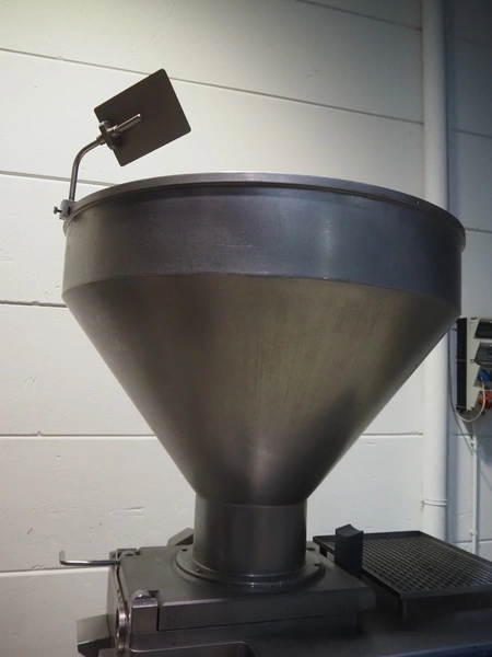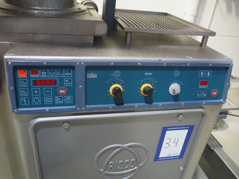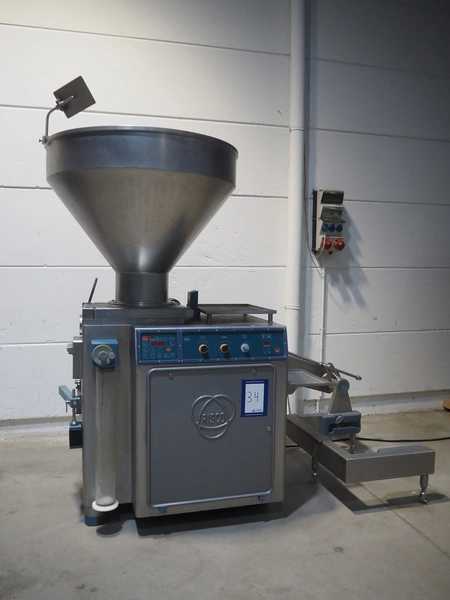 Risco Spa vacuum filling machine with lifter for 200 liter meat bins, type: RS 500100, serial number: 593030, 380 V, 3 Ph, 50 Hz, 25 A, 12 kW, with Busch vacuum pump, total dimensions: 2150 mm x 1100 mm x 2250 mm.