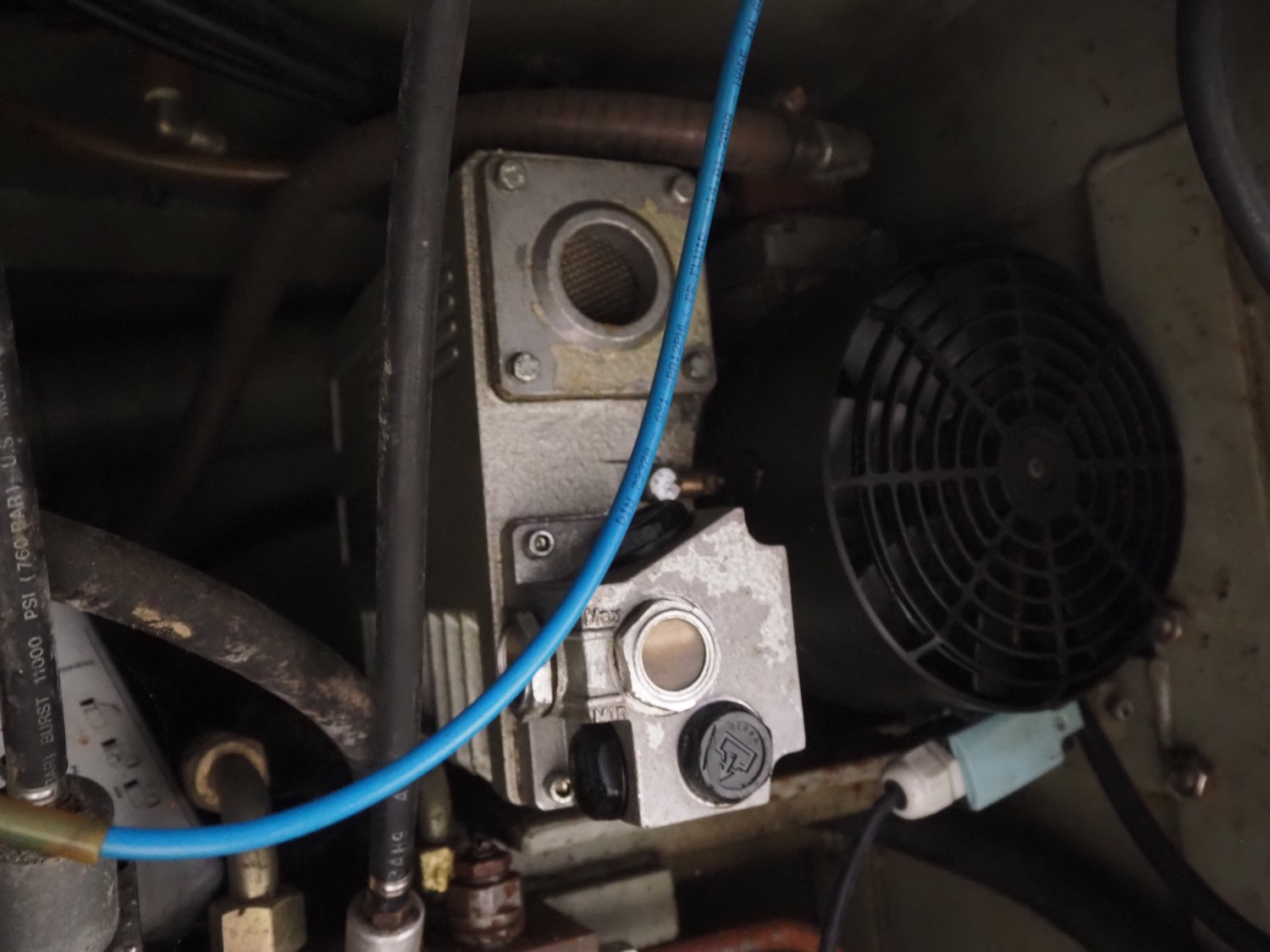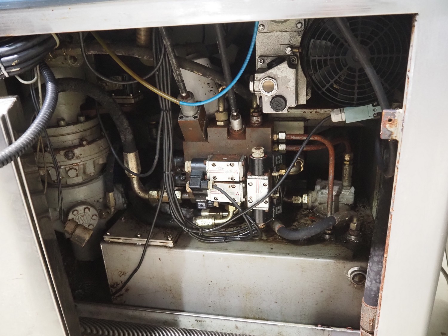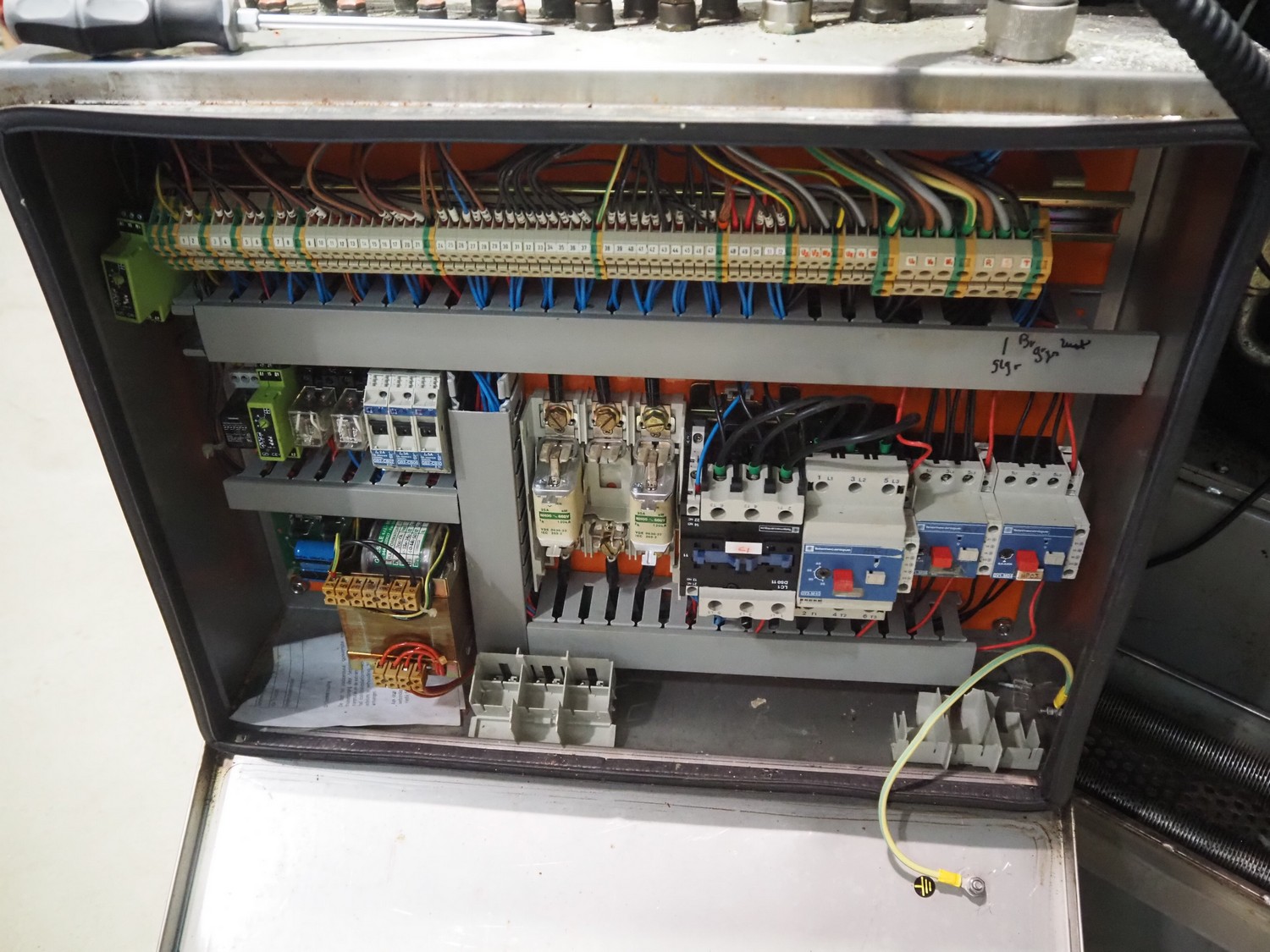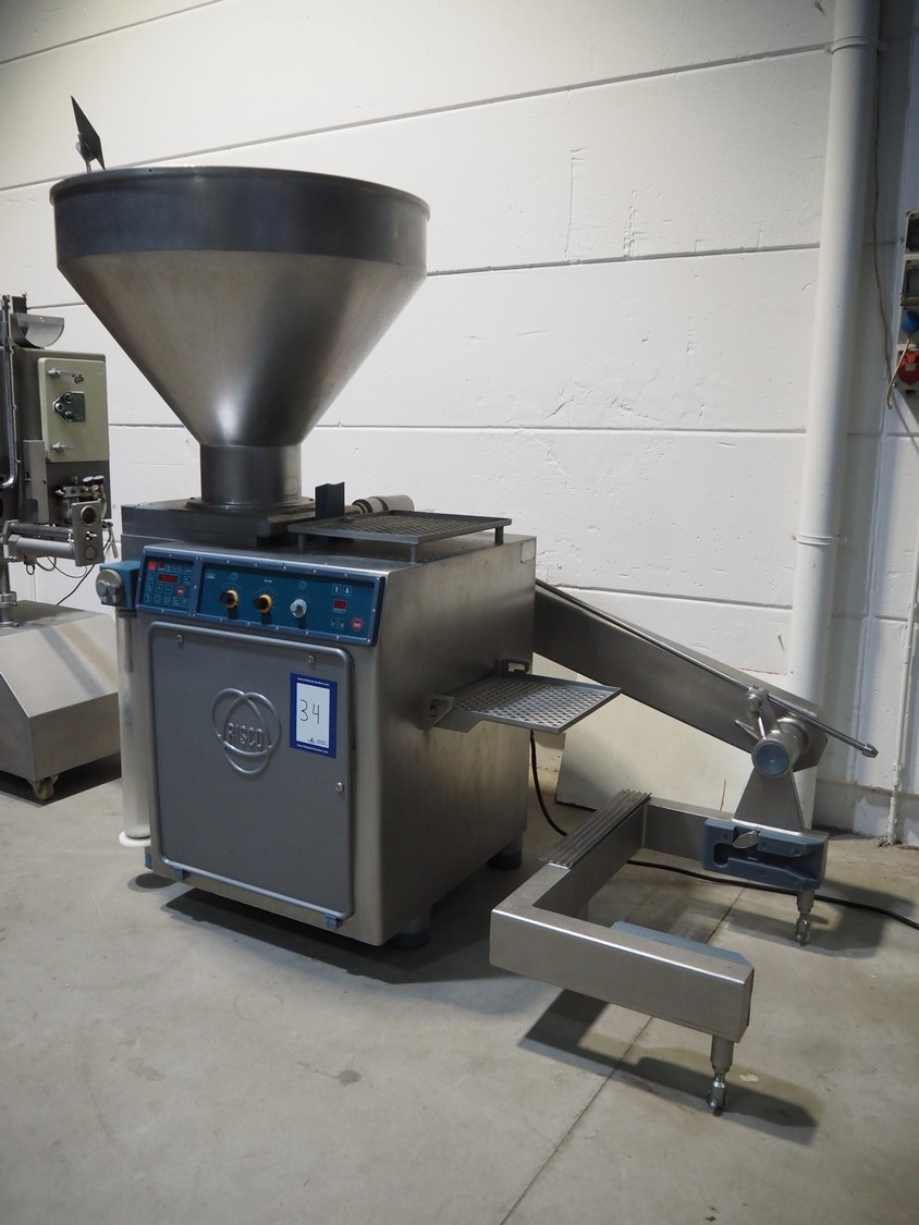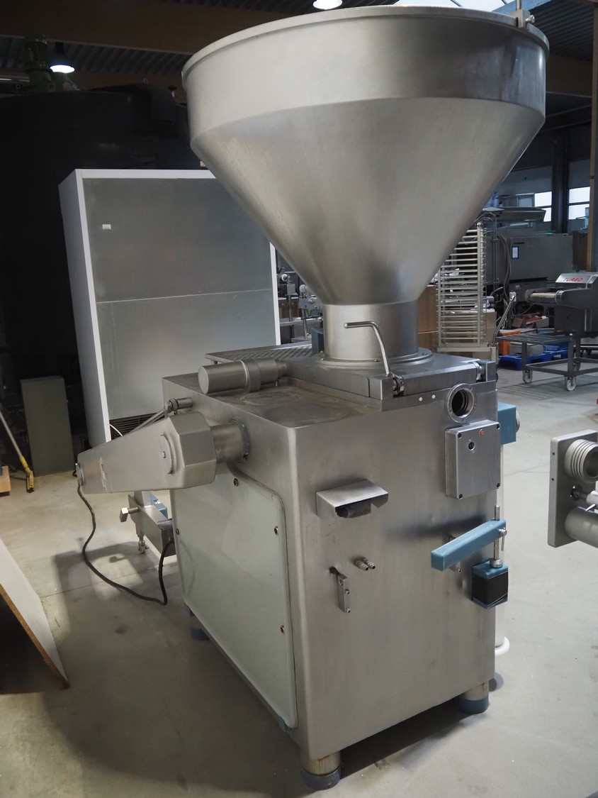 Risco Spa vacuum filling machine with lifter for 200 liter meat bins, type: RS 500100, serial number: 593030, 380 V, 3 Ph, 50 Hz, 25 A, 12 kW, with Busch vacuum pump, total dimensions: 2150 mm x 1100 mm x 2250 mm.
