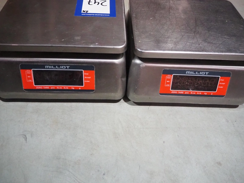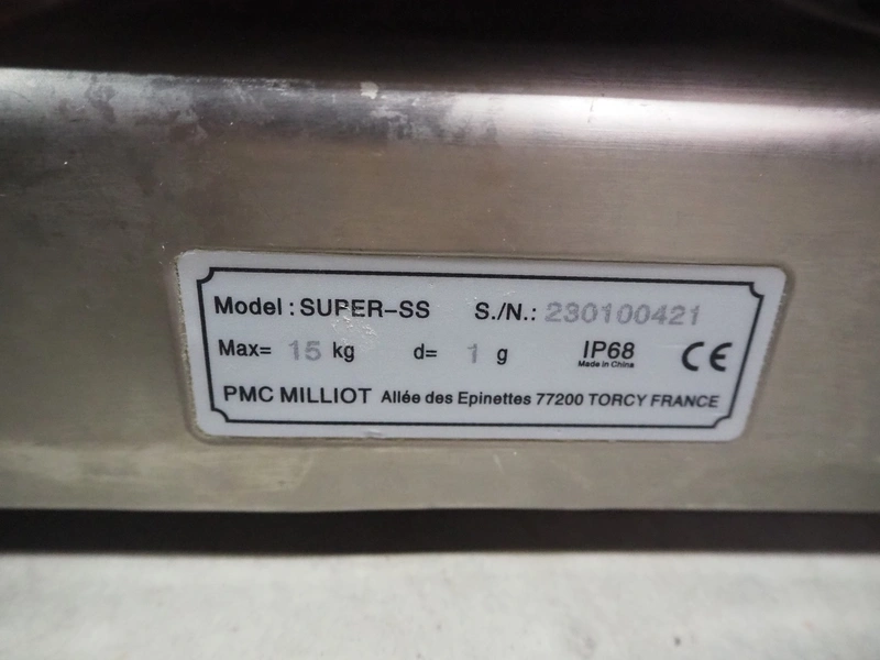 2 Pmc Milliot weighing scale, model: SS and SUPER-SS, serial number: 9112770158 and 230100421, maximum capacity: 15 kg, scale dimensions: (2x) 225 mm x 185 mm, total dimensions: (2x) 280 mm x 240 mm x 100 mm.