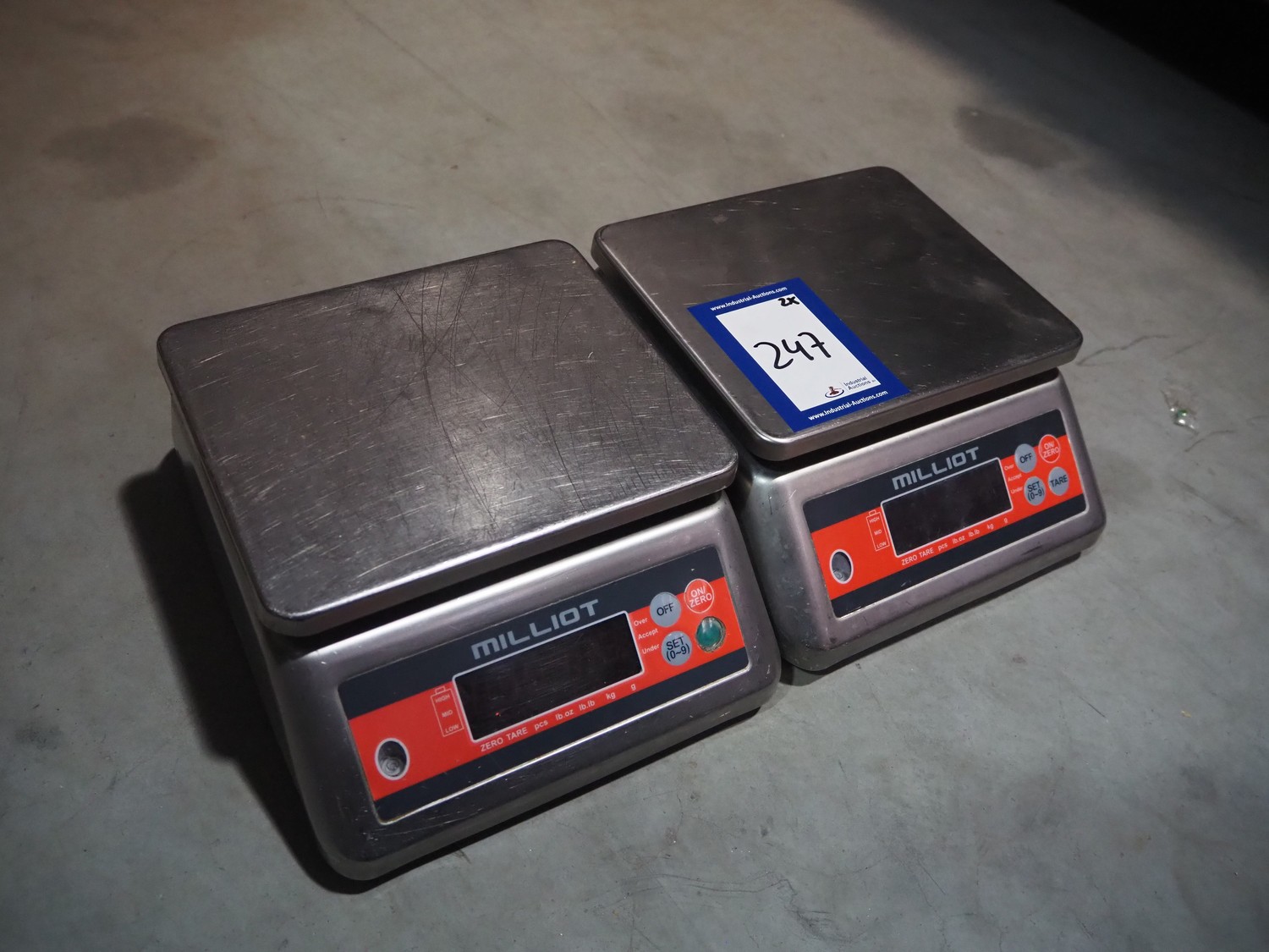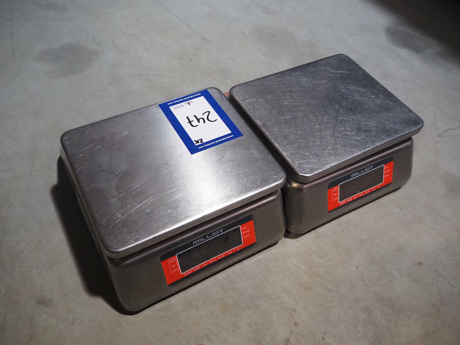 2 Pmc Milliot weighing scale, model: SS and SUPER-SS, serial number: 9112770158 and 230100421, maximum capacity: 15 kg, scale dimensions: (2x) 225 mm x 185 mm, total dimensions: (2x) 280 mm x 240 mm x 100 mm.