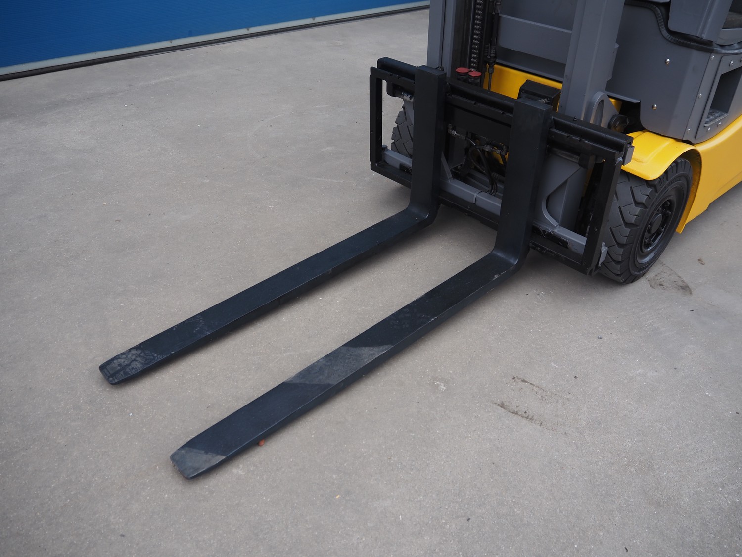 Jungheinrich electric forklift, model: EFG 316, serial number: FN505841, year of construction: 2016, rated capacity: 1600 kg, fork length: 1200 mm, total dimensions: 3400 mm x 1100 mm x 3550 mm. Including battery charger. Battery renewed in 2024.