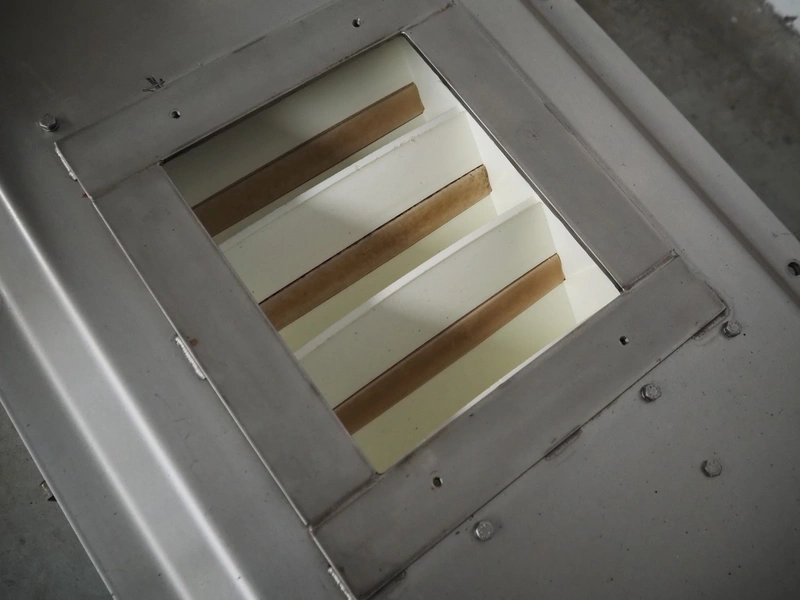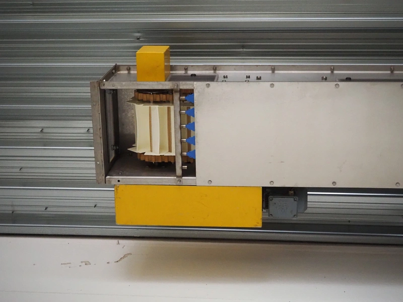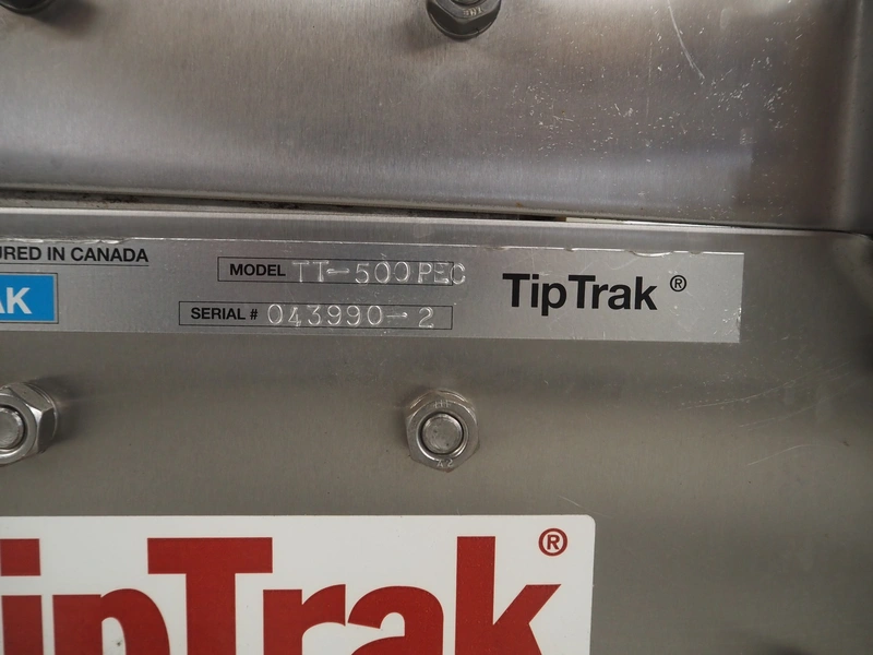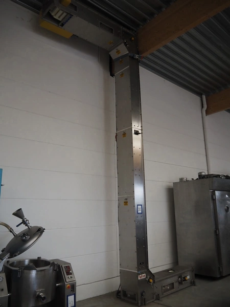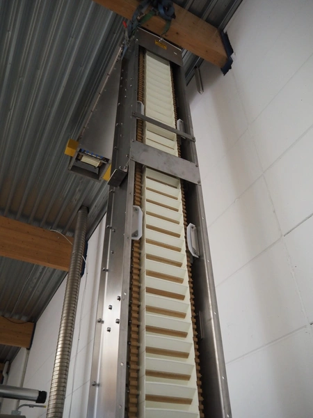 Unitrak elevating belt, model: TT-500PEC, serial number: 043990-2, plastic belt with dividers, belt width: 255 mm, divider height: 140 mm, distance between dividers: 100 mm, elevating height: 5800 mm, total dimensions: 4400 mm x 600 mm x 6225 mm.