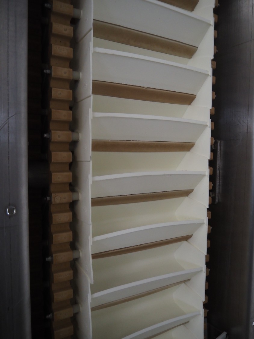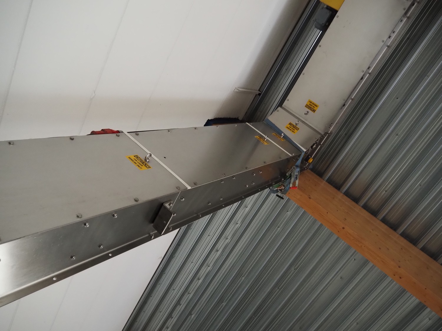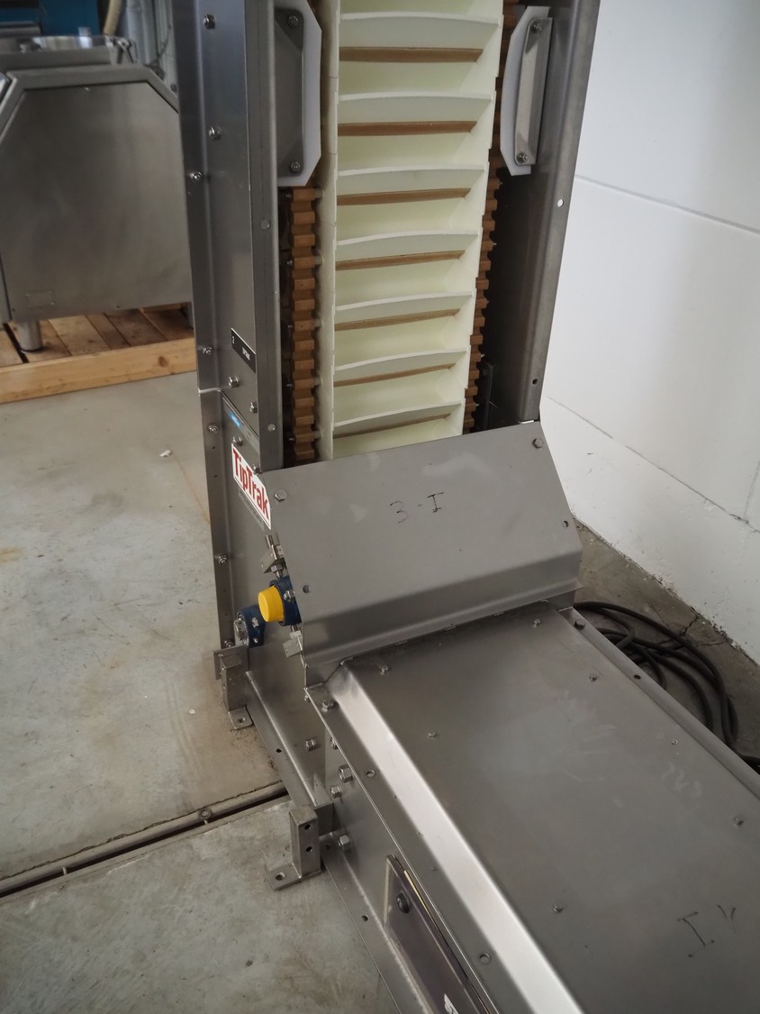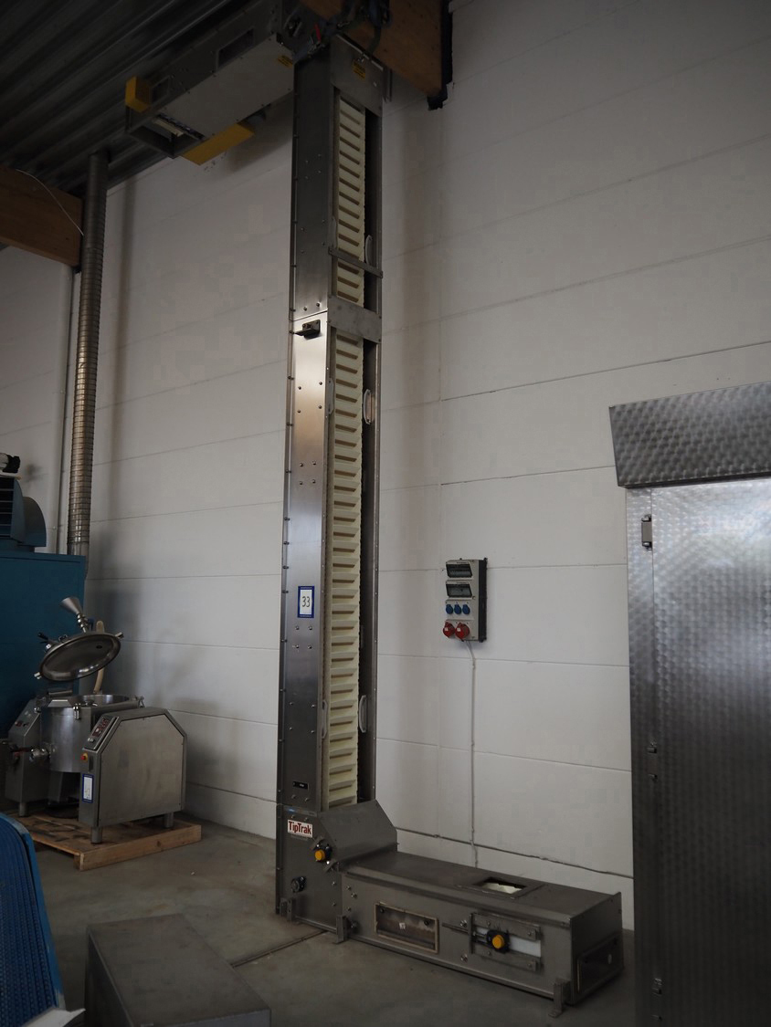 Unitrak elevating belt, model: TT-500PEC, serial number: 043990-2, plastic belt with dividers, belt width: 255 mm, divider height: 140 mm, distance between dividers: 100 mm, elevating height: 5800 mm, total dimensions: 4400 mm x 600 mm x 6225 mm.