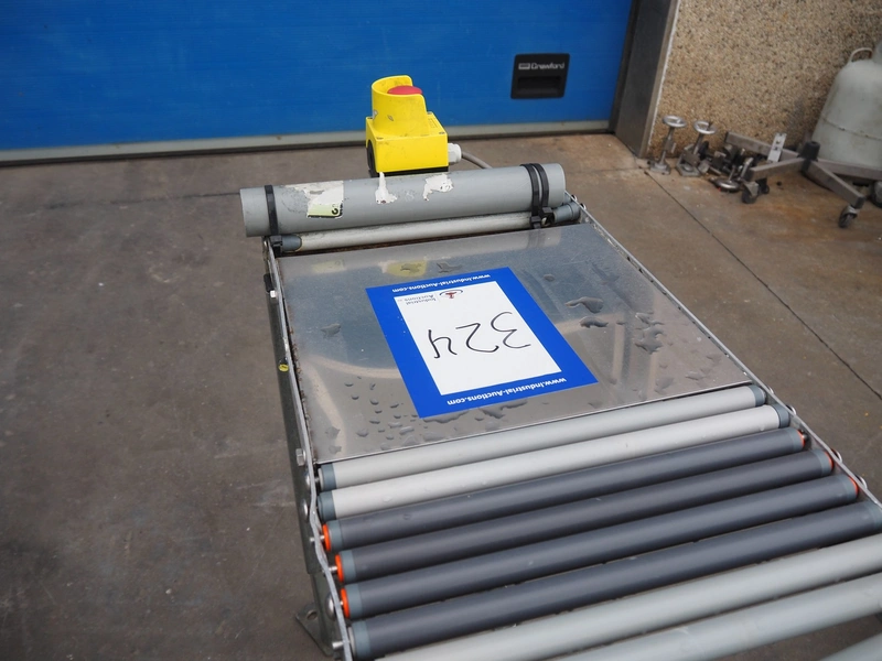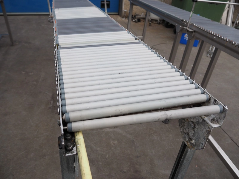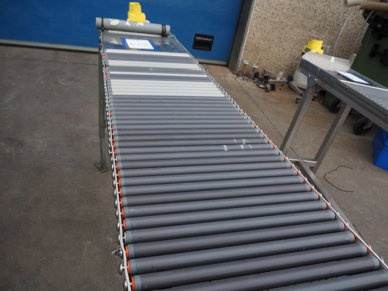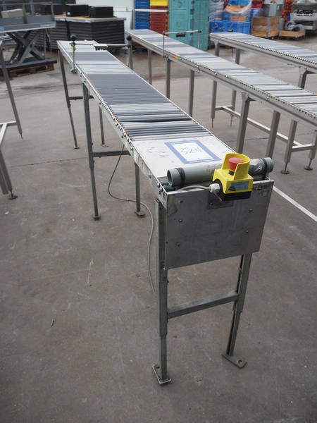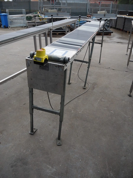 Prominox nv. s/s roller conveyor, plastic rollers, roller width: 335 mm, total dimensions: 3750 mm x 450 mm x 1200 mm.