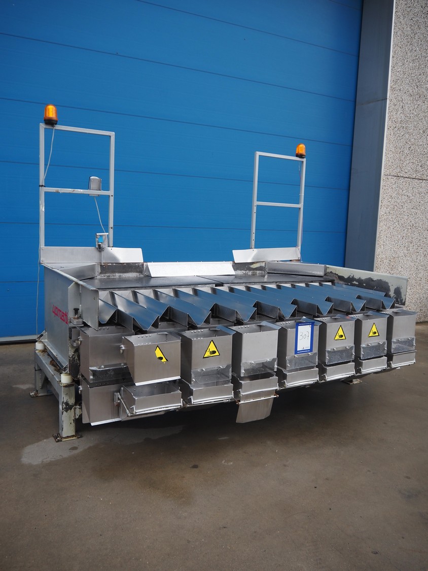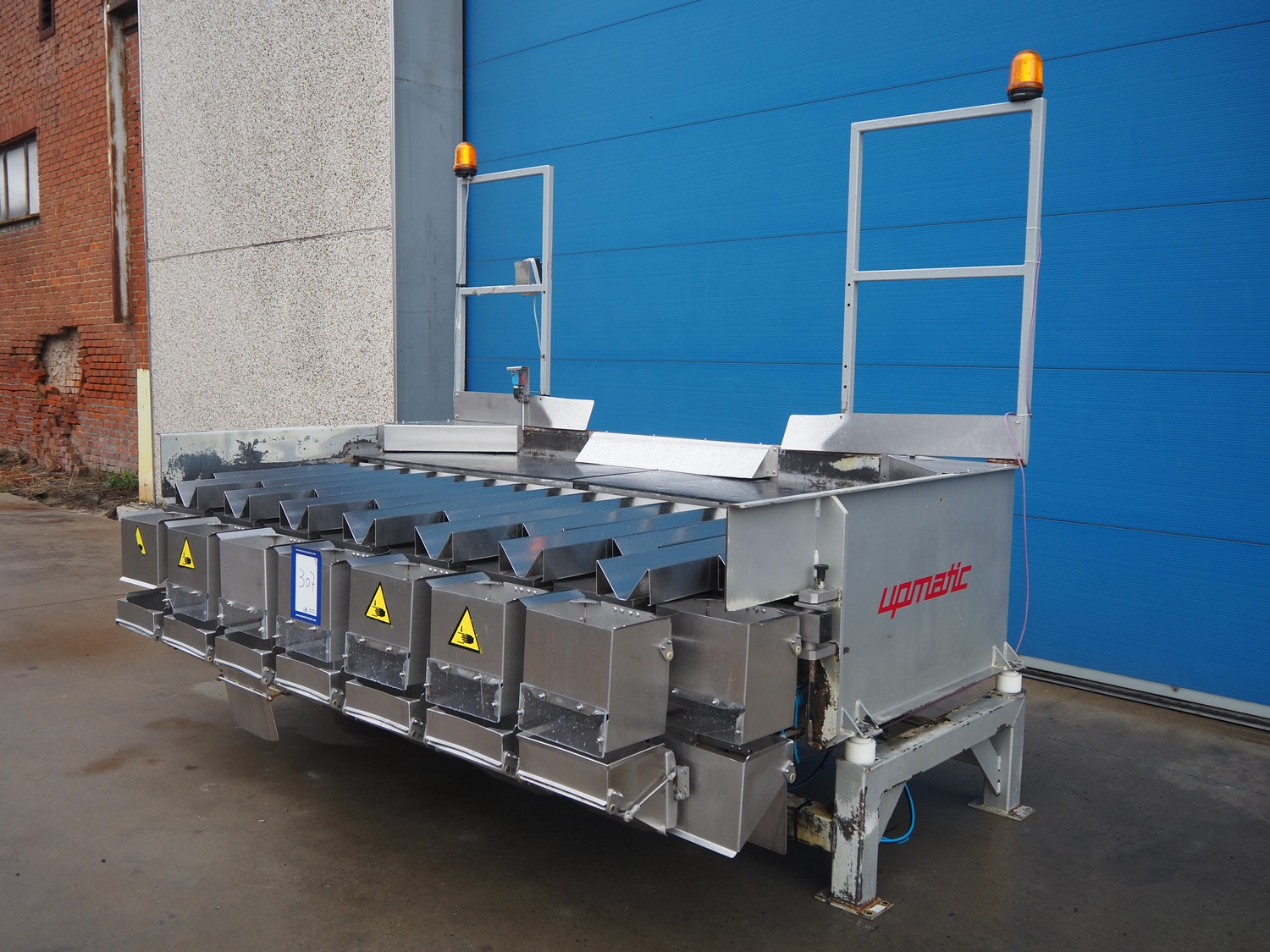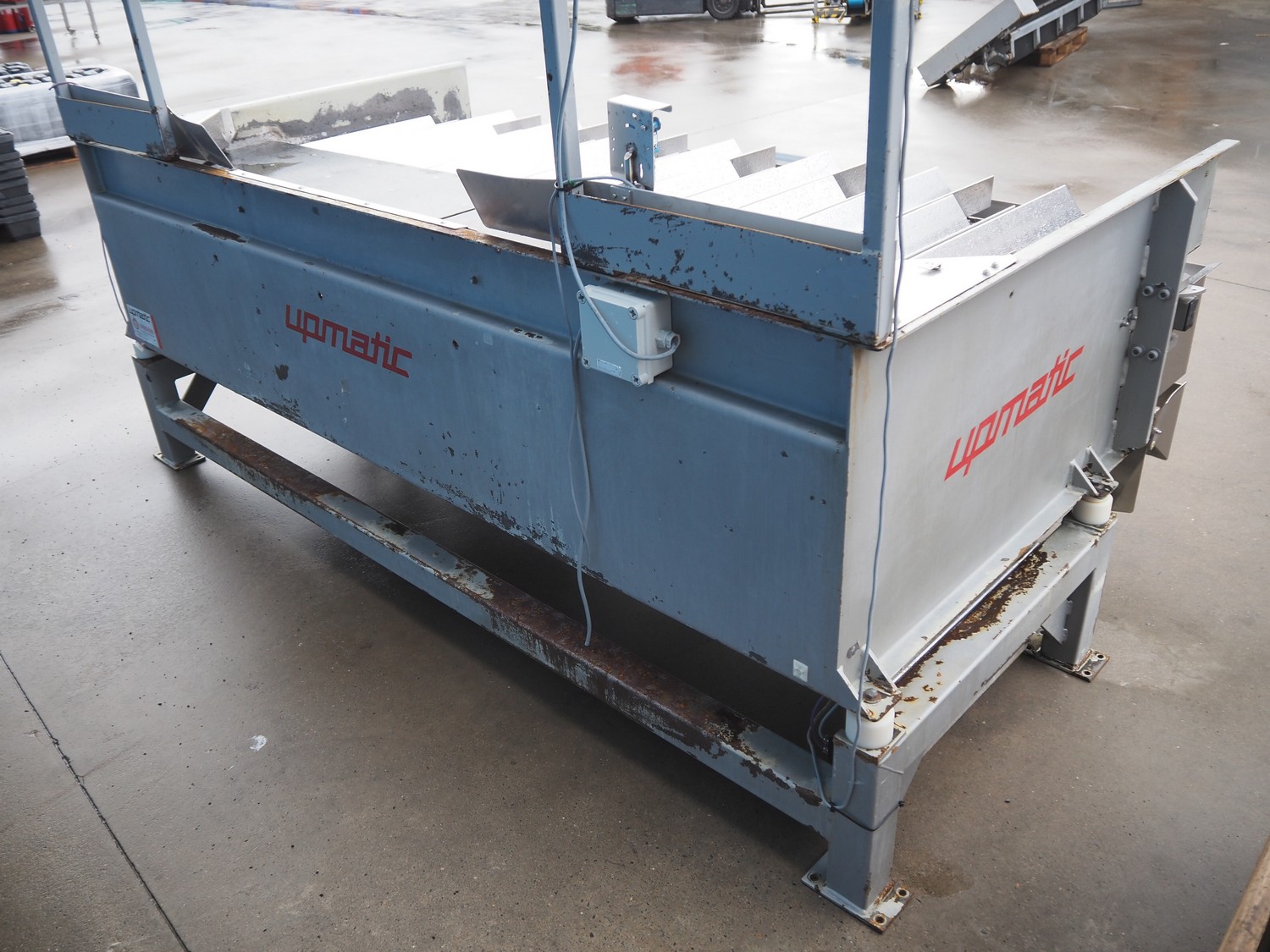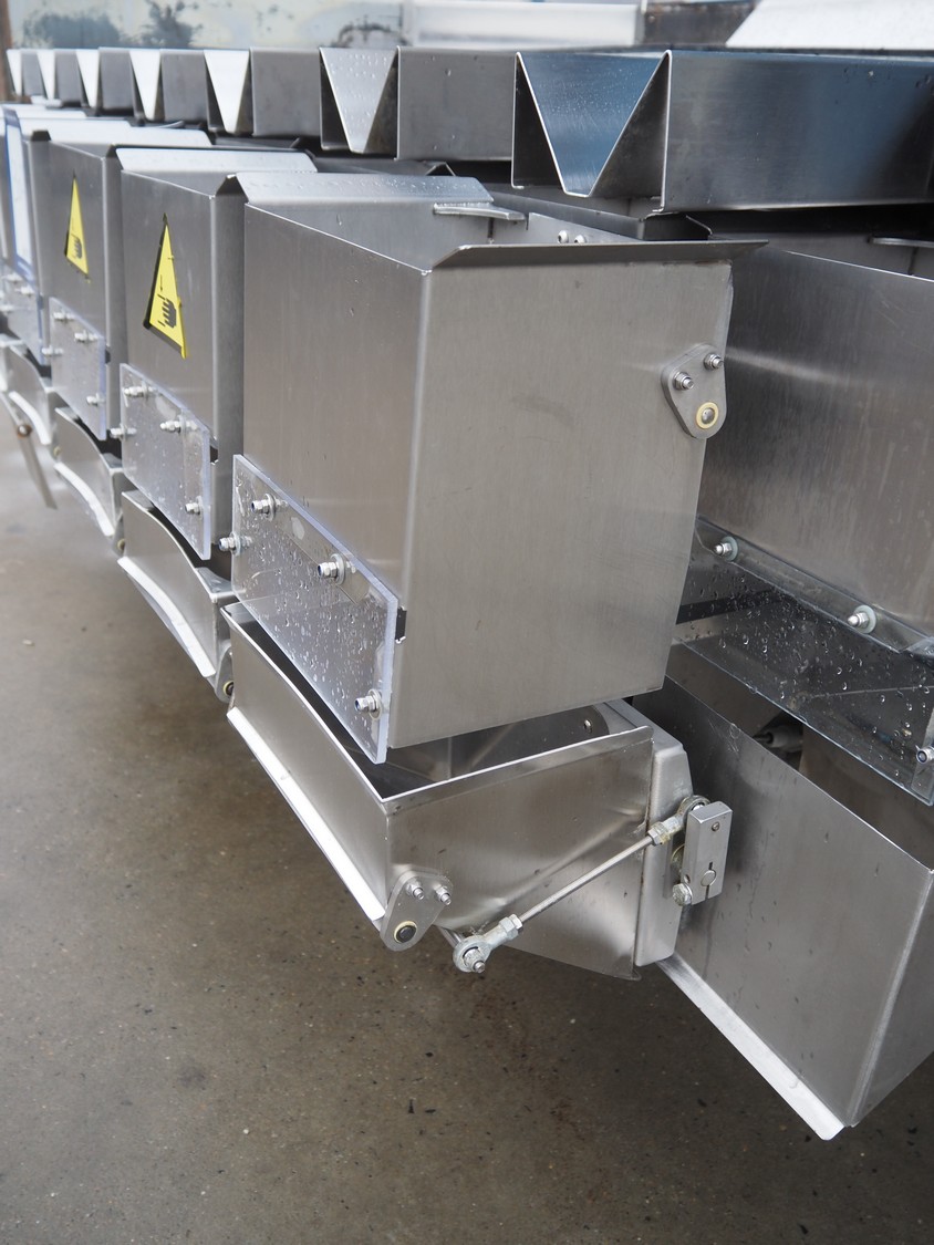 Upmann Verpackungsmaschinen 7 heads lineair weigher, model: Upmatic, dimension each head: 245 mm x 160 mm, total dimensions: 2500 mm x 1530 mm x 2120 mm and Upmann Verpackungsmaschinen infeed bunker, infeed width: 2530 mm x 410 mm, total dimensions infeed bunker: 3190 mm x 870 mm x 670 mm. Including pallet box with parts.