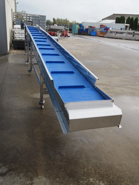 Mobile elevating belt with dividers, s/s frame, plastic belt, belt width: 400 mm, divider width: 320 mm, distance between dividers: 410 mm, divider height: 23 mm, elevating height: 1050 mm, total dimensions: 6550 mm x 630 mm x 1280 mm.