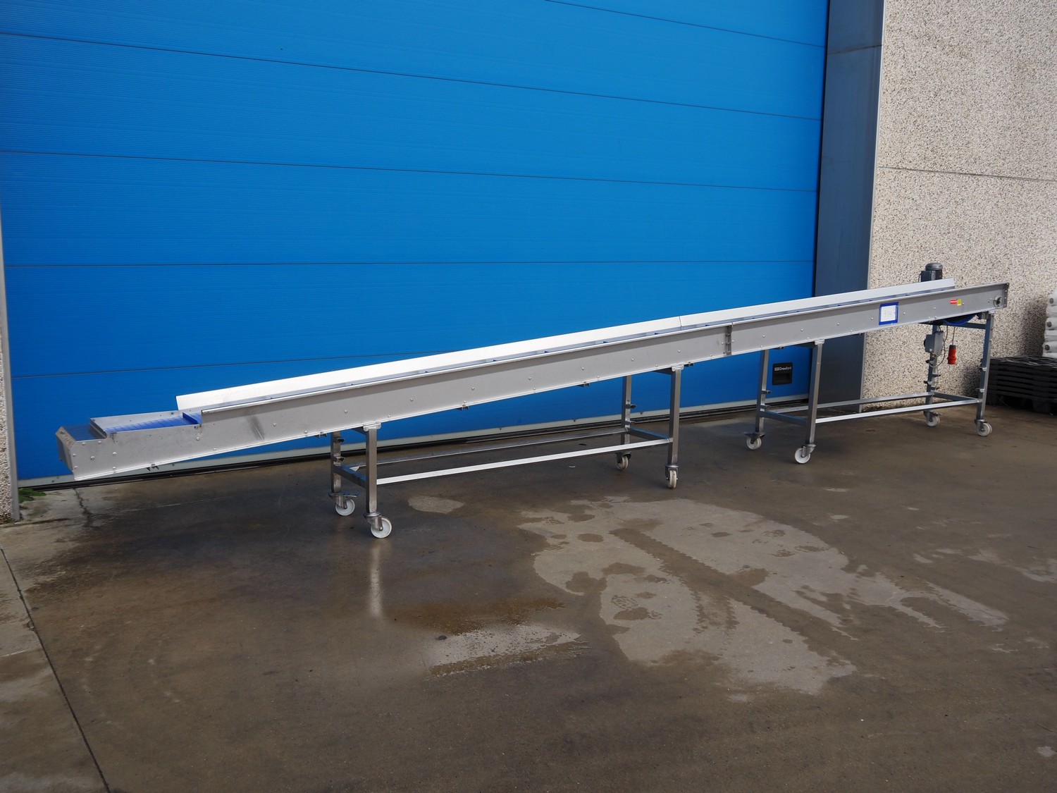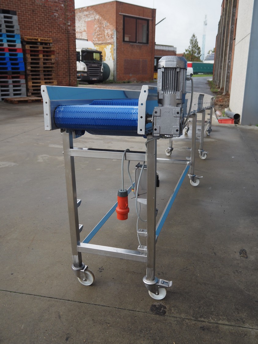 Mobile elevating belt with dividers, s/s frame, plastic belt, belt width: 400 mm, divider width: 320 mm, distance between dividers: 410 mm, divider height: 23 mm, elevating height: 1050 mm, total dimensions: 6550 mm x 630 mm x 1280 mm.