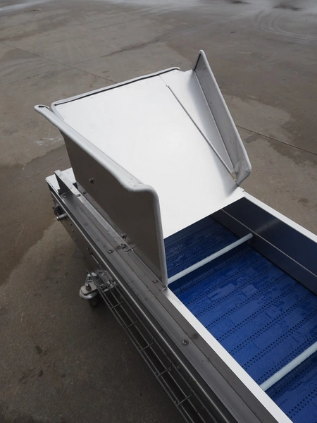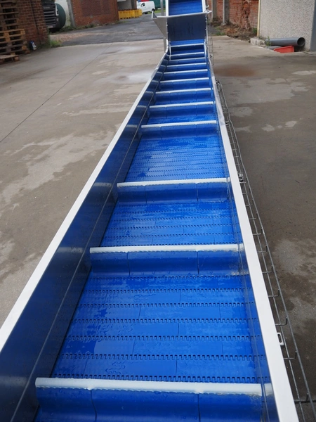 Mobile elevating belt with dividers, s/s frame, plastic belt, divider width: 416 mm, distance between dividers: 400 mm, divider height: 80 mm, elevating height: 2250 mm, total dimensions: 8500 mm x 750 mm x 2460 mm.