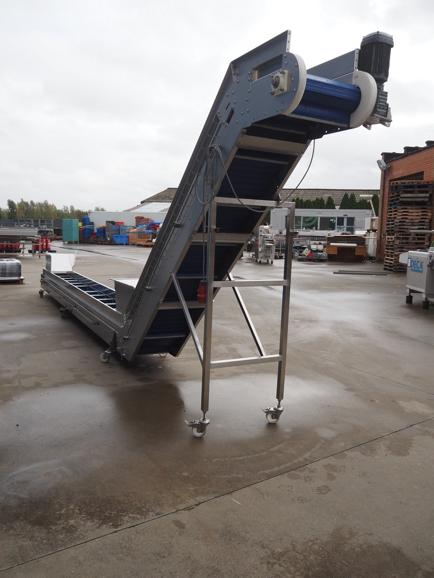 Mobile elevating belt with dividers, s/s frame, plastic belt, divider width: 416 mm, distance between dividers: 400 mm, divider height: 80 mm, elevating height: 2250 mm, total dimensions: 8500 mm x 750 mm x 2460 mm.