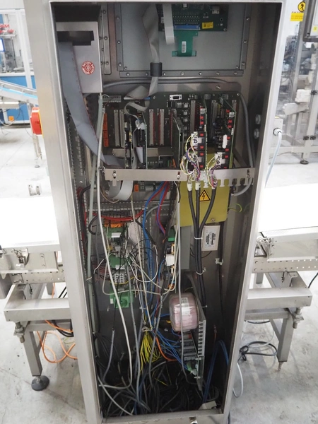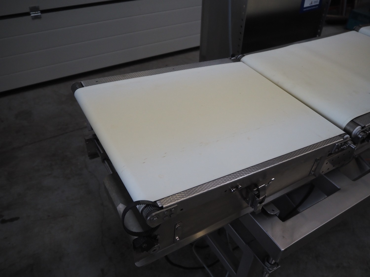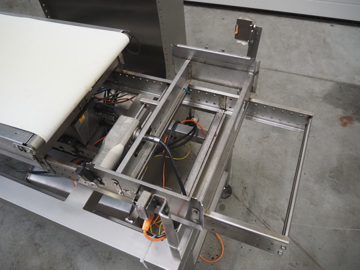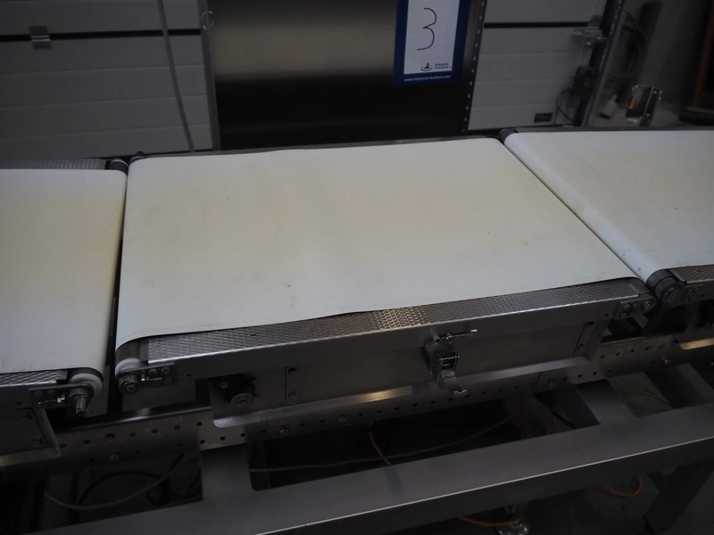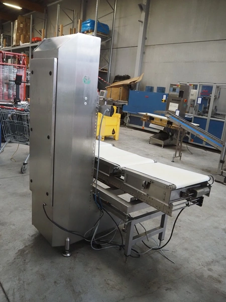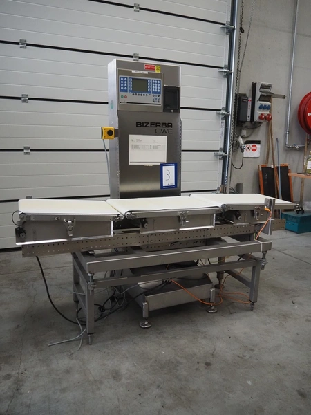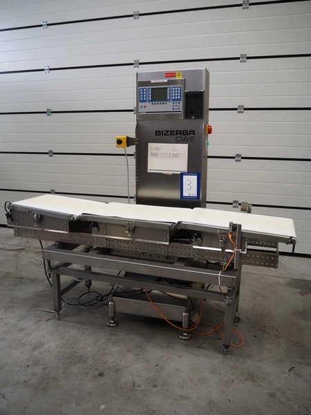 Bizerba checkweigher, model: CWE, number: 10754549, 120/220-240 V, 50/60 Hz, 3/5 A, max: 3000/6000 gram, min: 150 gram, e=d= 1/2 gram, plastic belt, belt width: 400 mm, total dimensions: 1810 mm x 850 mm x 1700 mm.