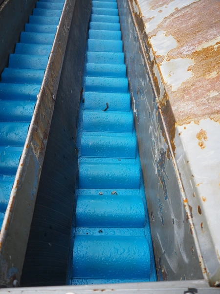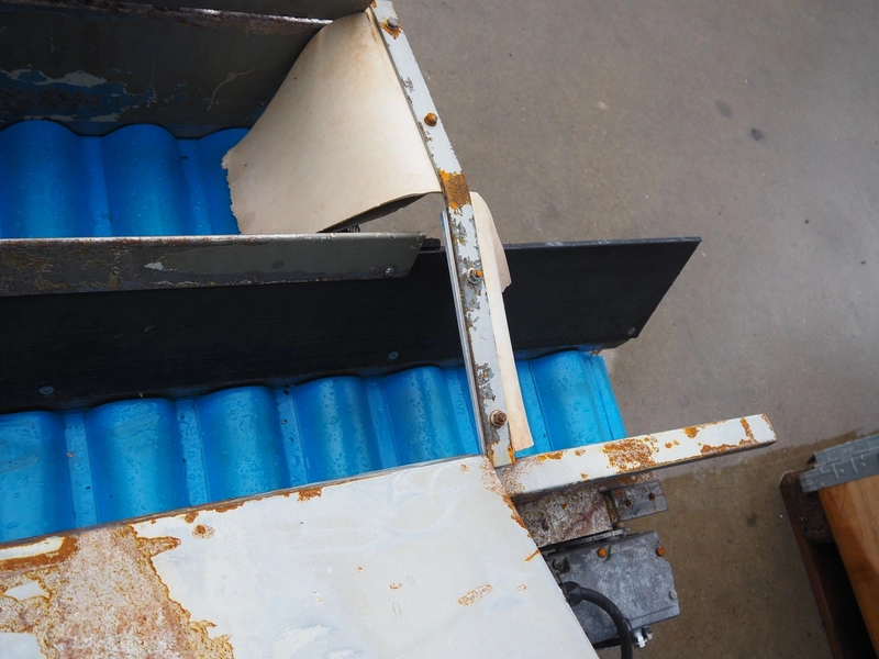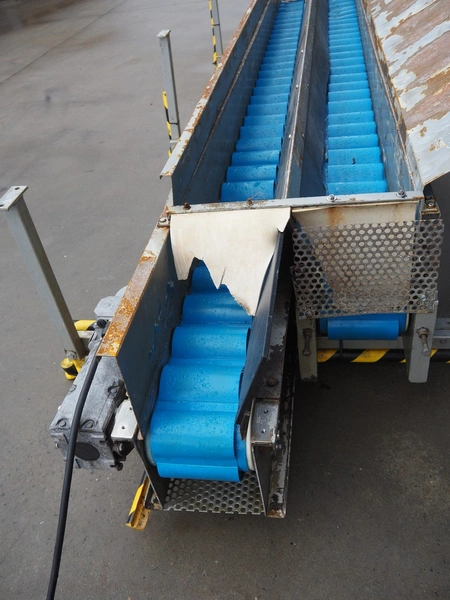 Upmann Verpackungsmaschinen sorting belt, model: upmatic, plastic belt with dividers, divider width: 145 mm, distance between dividers: 120 mm, divider height: 25 mm, total dimensions: 3800 mm x 1200 mm x 700 mm.