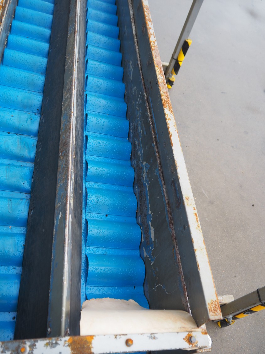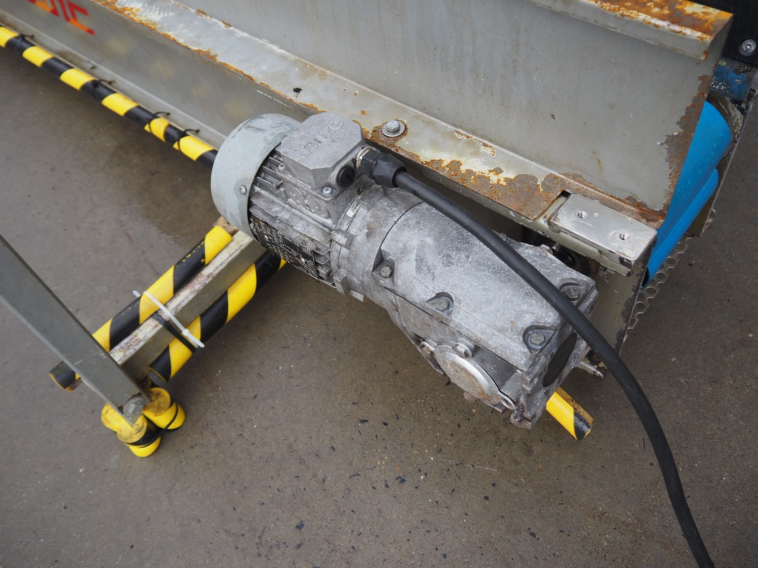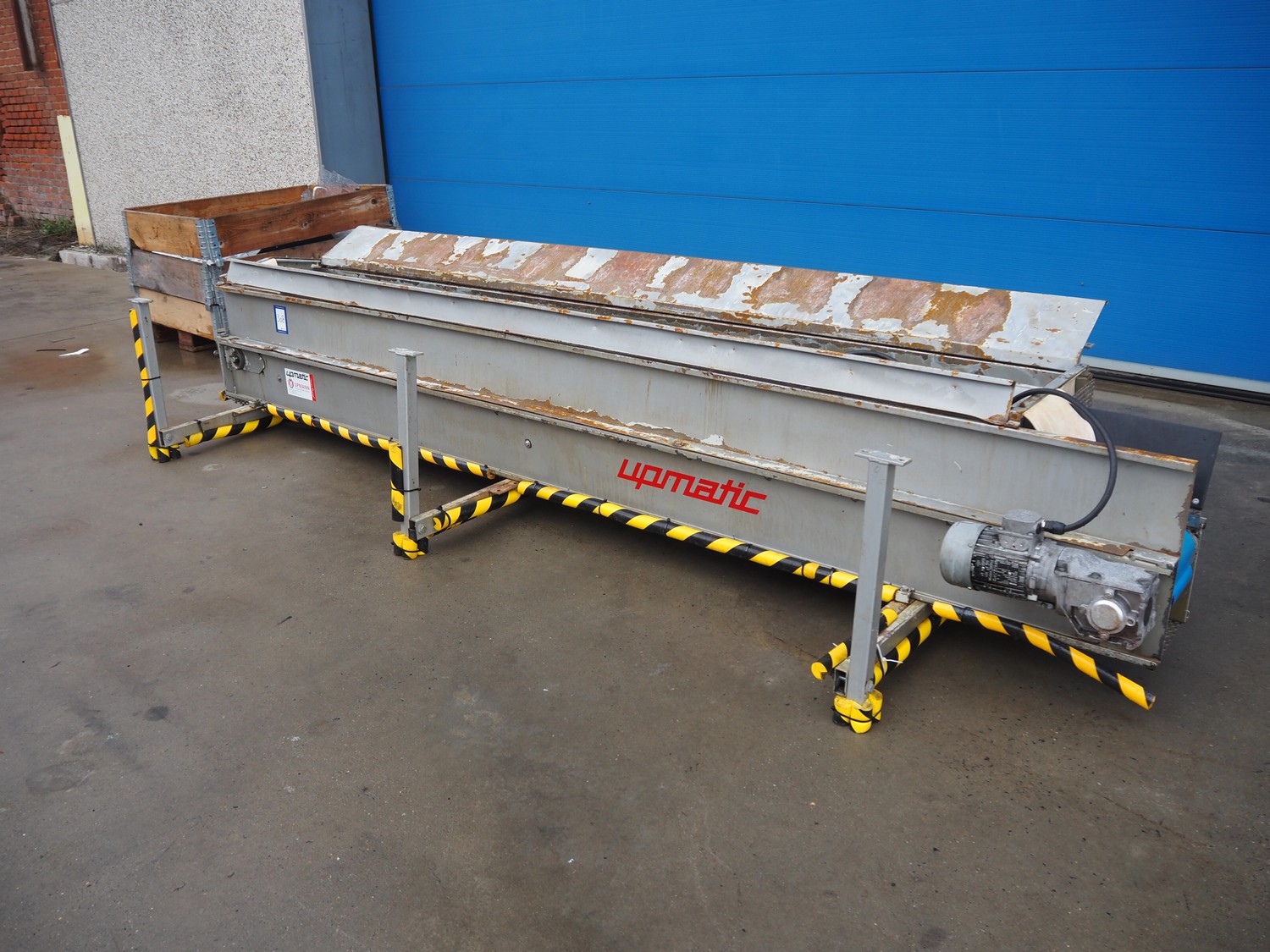 Upmann Verpackungsmaschinen sorting belt, model: upmatic, plastic belt with dividers, divider width: 145 mm, distance between dividers: 120 mm, divider height: 25 mm, total dimensions: 3800 mm x 1200 mm x 700 mm.