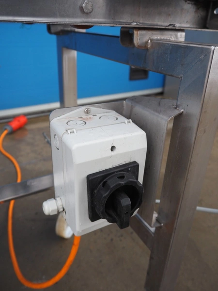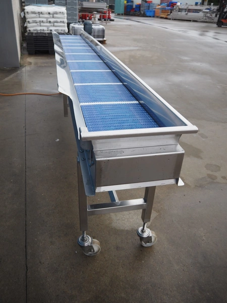 Mobile transport belt, s/s frame, plastic belt, belt width: 300 mm, total dimensions: 3380 mm x 600 mm x 1000 mm.