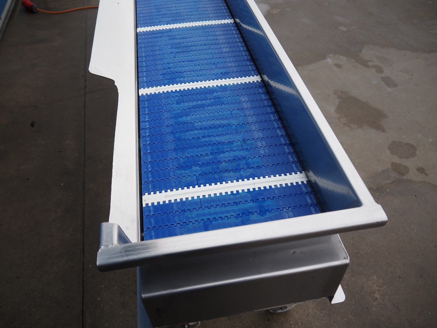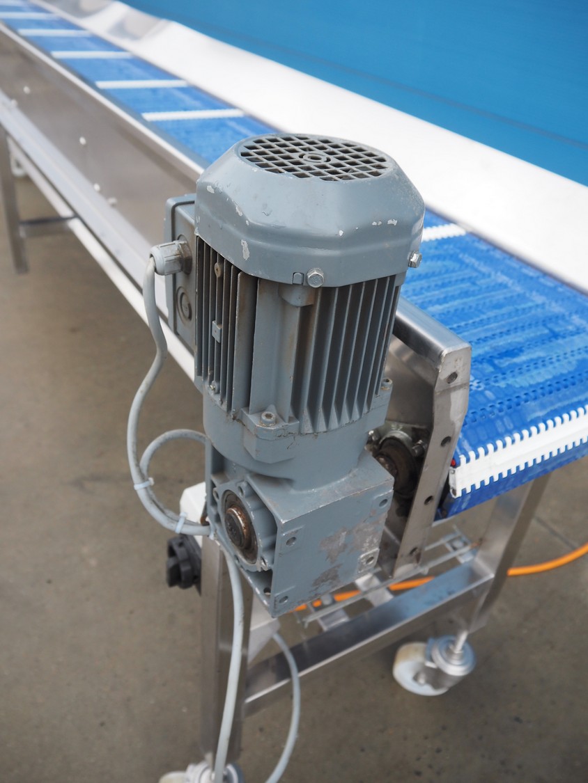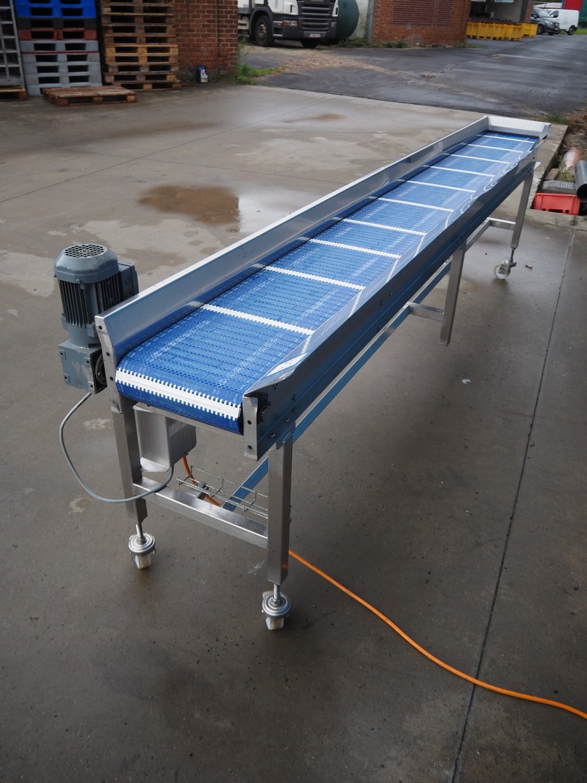Mobile transport belt, s/s frame, plastic belt, belt width: 300 mm, total dimensions: 3380 mm x 600 mm x 1000 mm.