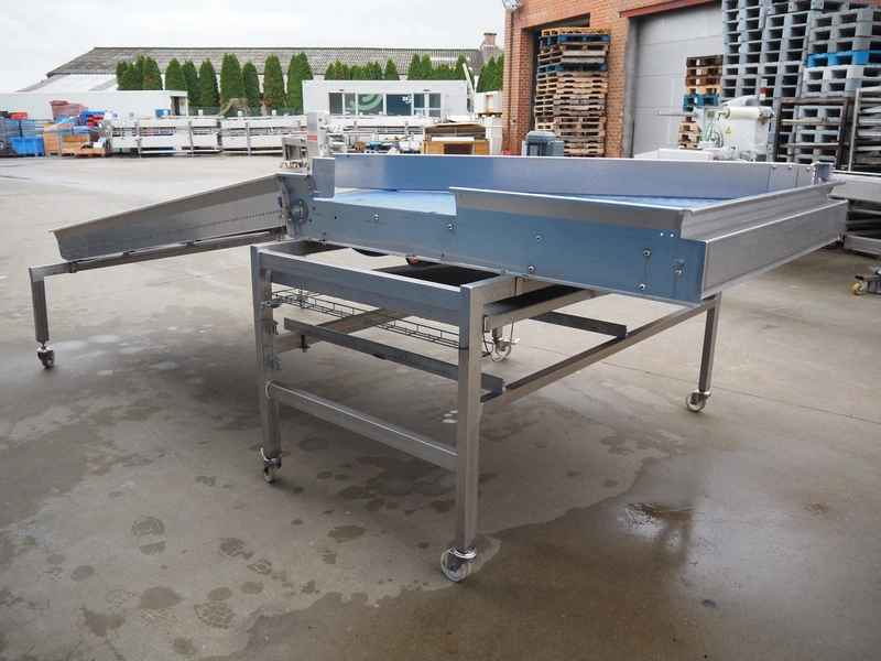 Mobile dividing belt, s/s frame, plastic belt, belt width: 1460 mm, s/s rollers, roller width: (2x) 720 mm, total dimensions: 3900 mm x 2000 mm x 1350 mm.