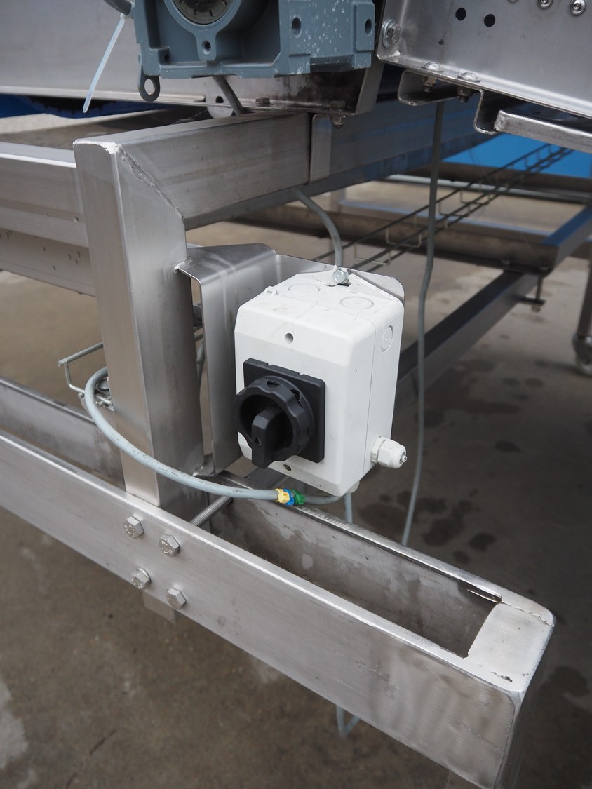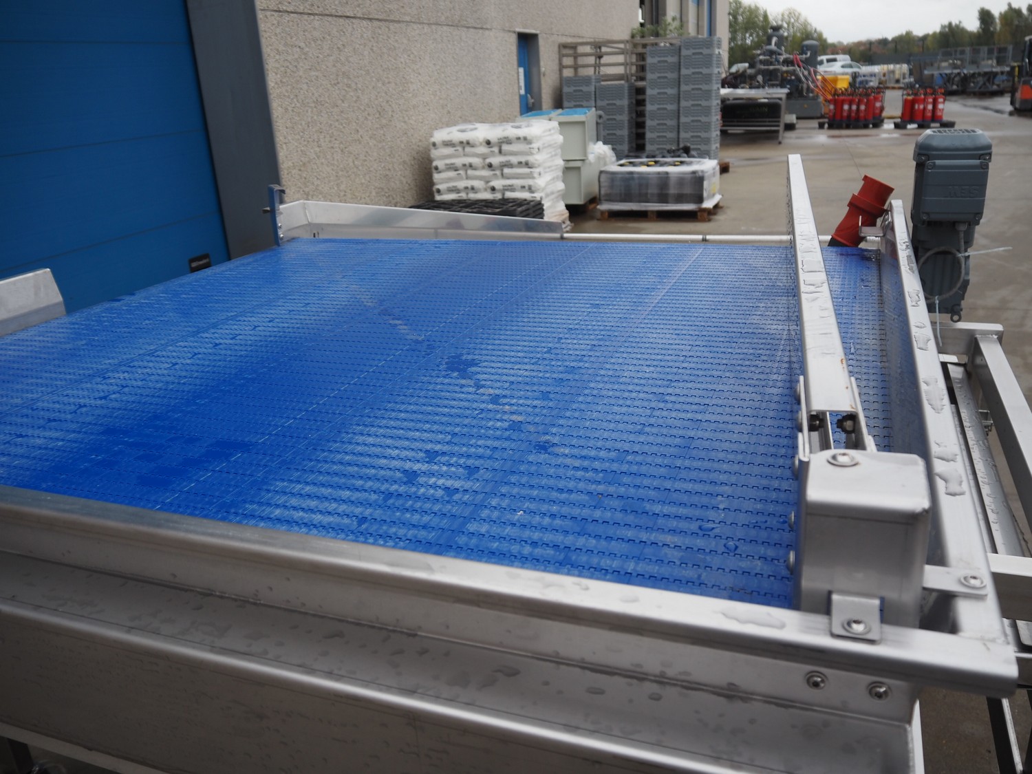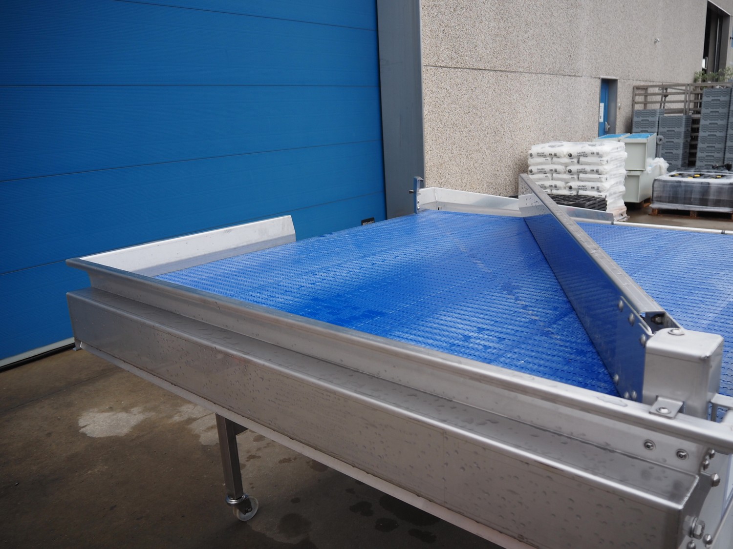 Mobile dividing belt, s/s frame, plastic belt, belt width: 1460 mm, s/s rollers, roller width: (2x) 720 mm, total dimensions: 3900 mm x 2000 mm x 1350 mm.