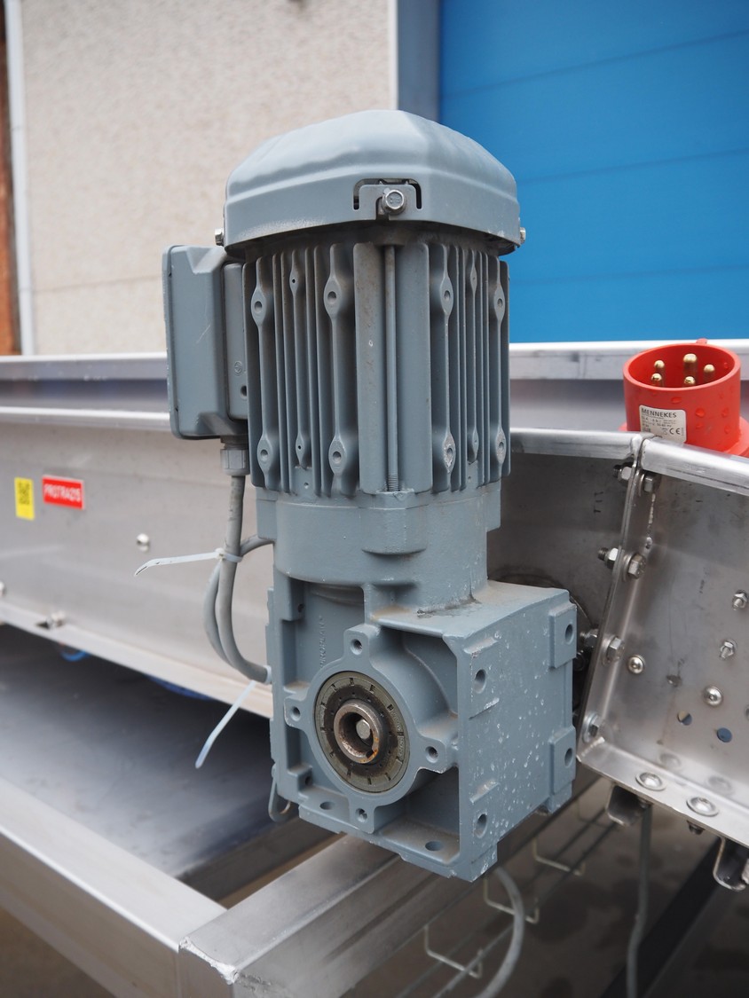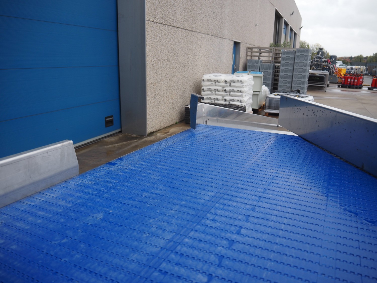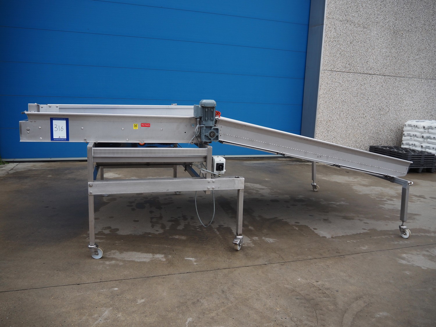 Mobile dividing belt, s/s frame, plastic belt, belt width: 1460 mm, s/s rollers, roller width: (2x) 720 mm, total dimensions: 3900 mm x 2000 mm x 1350 mm.