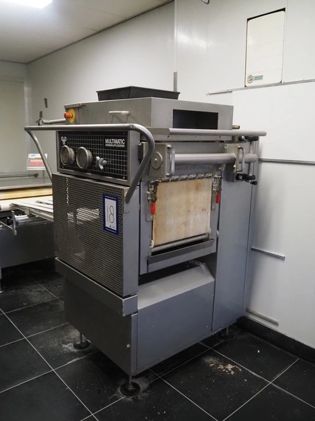 Werner & Pfleiderer Haton BV dividing and rounding machine, infeed clearance: 340 mm x 360 mm, dye dimensions: 65 mm x 75 mm, cloth belt, belt width: (1x) 460 mm, (6x) 60 mm, brush length: 410 mm, total dimensions: 2250 mm x 1200 mm x 1760 mm. Including 2 extra dyes, dye dimensions: (1x) 75 mm x 65 mm, (1x) 60 mm x 65 mm.