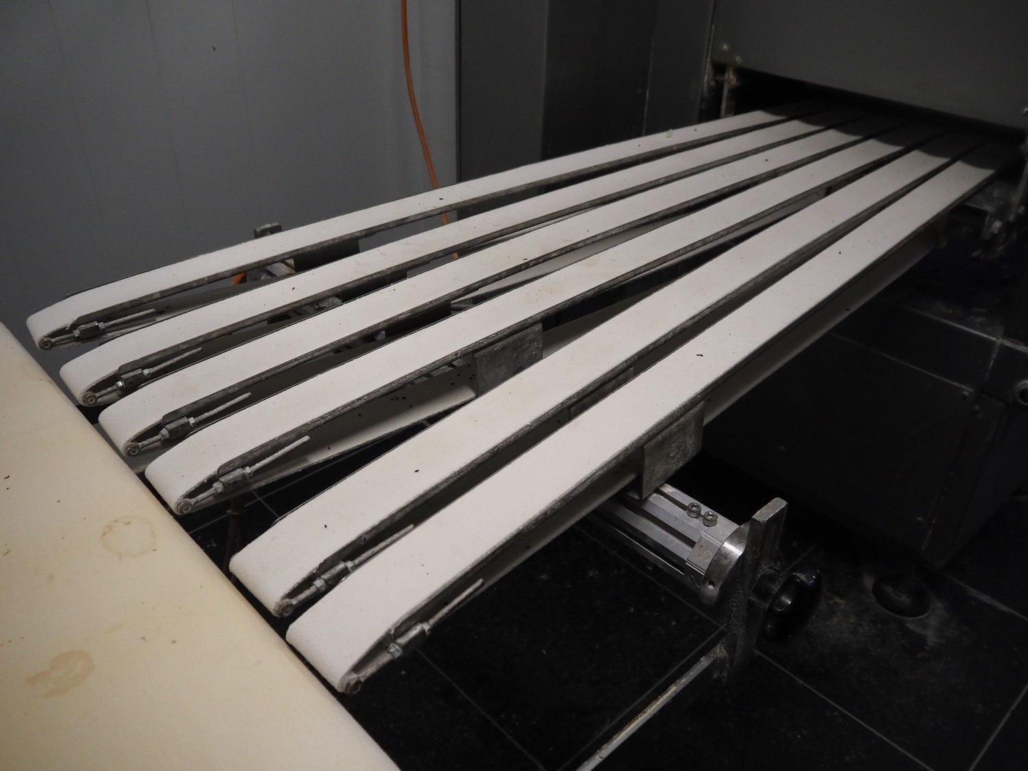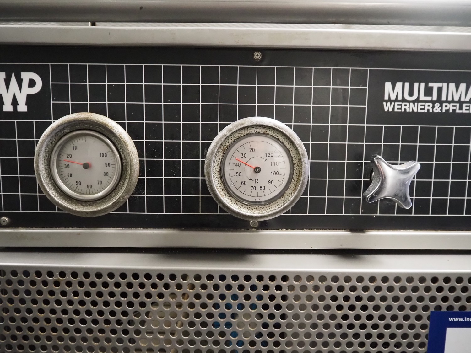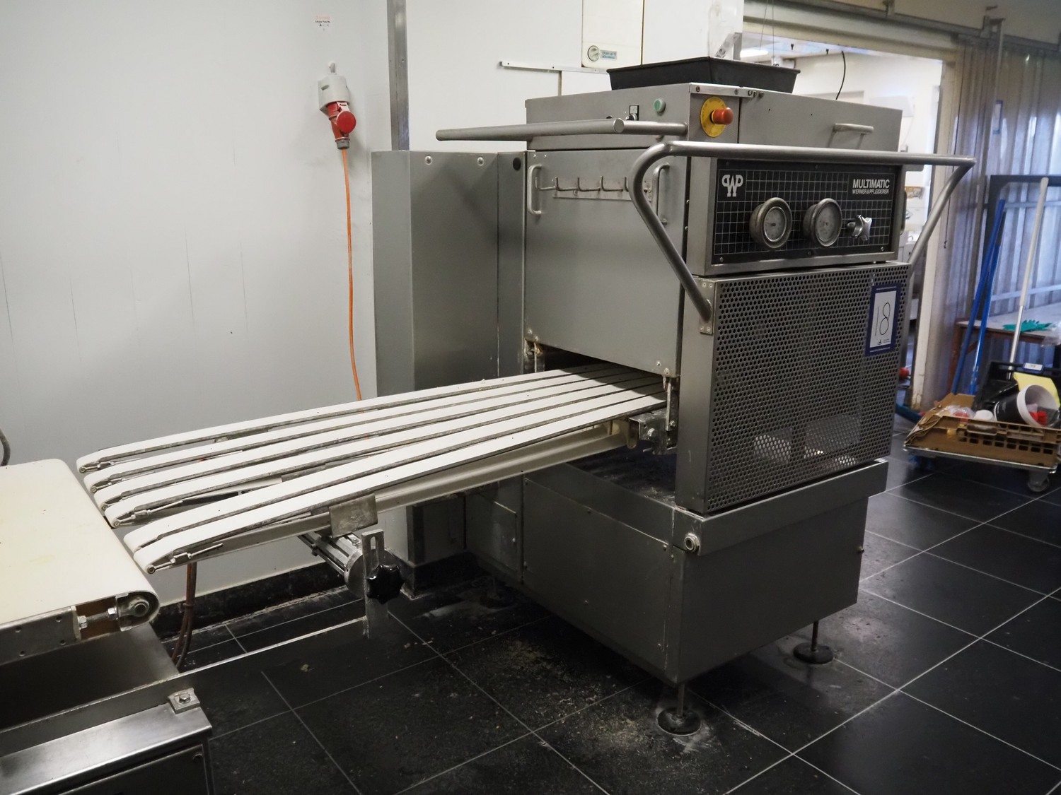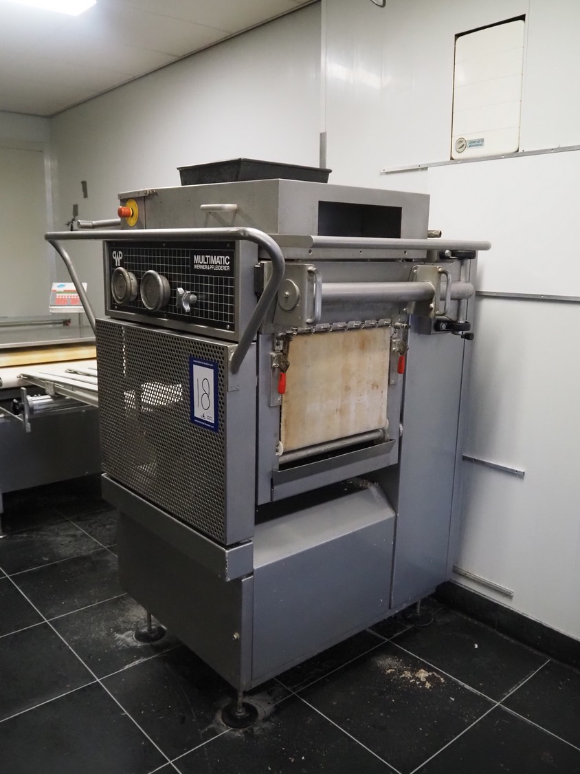Werner & Pfleiderer Haton BV dividing and rounding machine, infeed clearance: 340 mm x 360 mm, dye dimensions: 65 mm x 75 mm, cloth belt, belt width: (1x) 460 mm, (6x) 60 mm, brush length: 410 mm, total dimensions: 2250 mm x 1200 mm x 1760 mm. Including 2 extra dyes, dye dimensions: (1x) 75 mm x 65 mm, (1x) 60 mm x 65 mm.