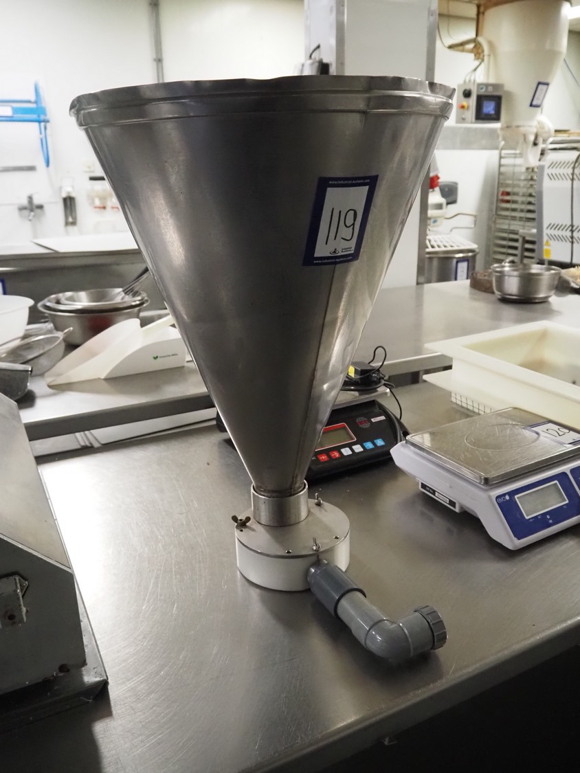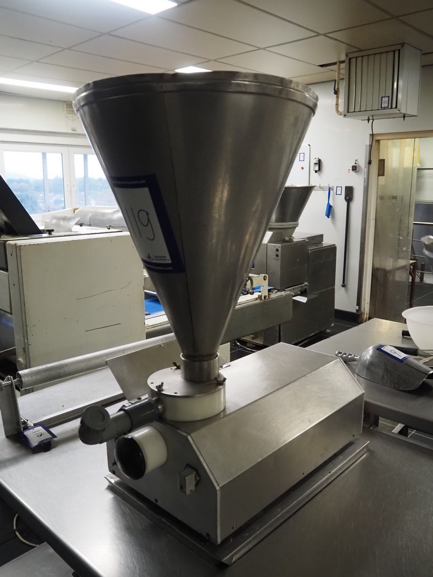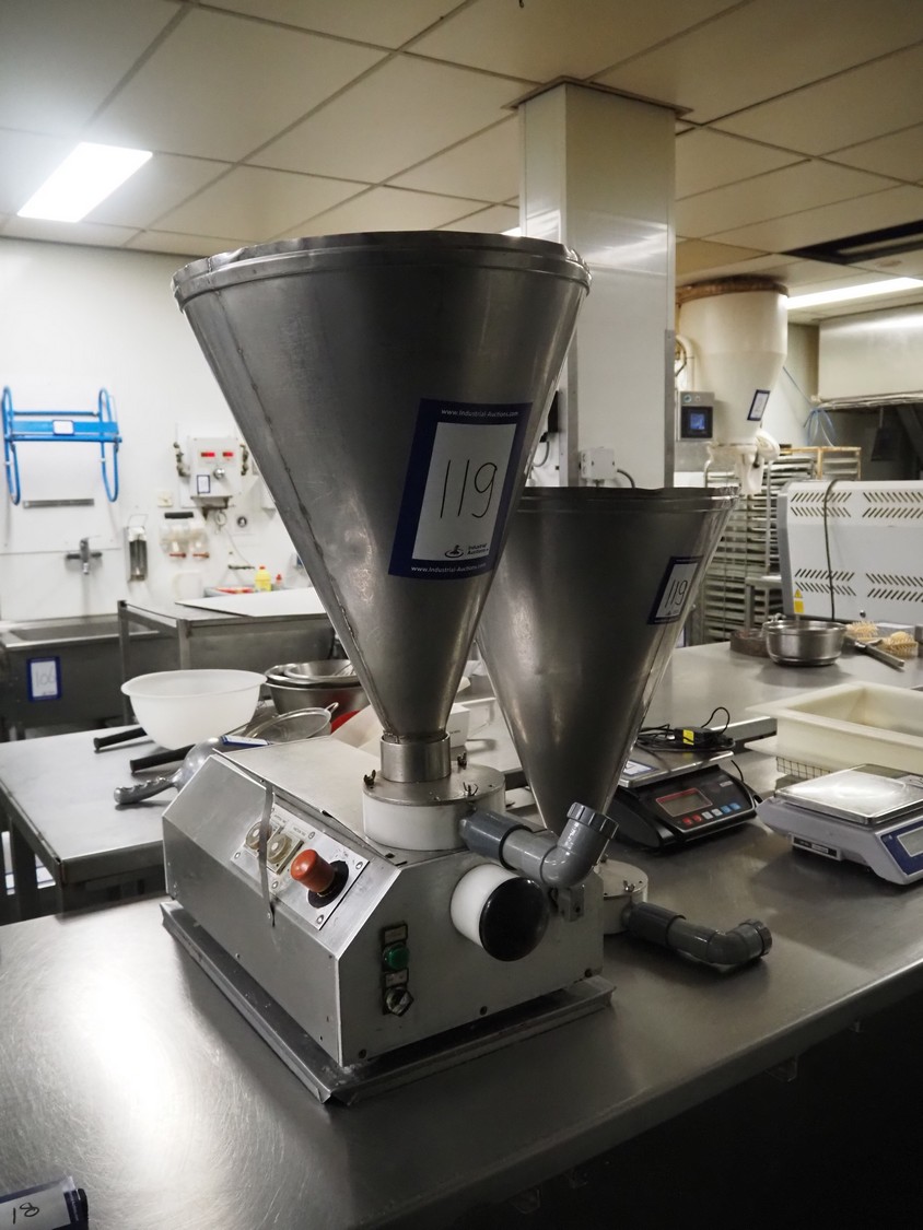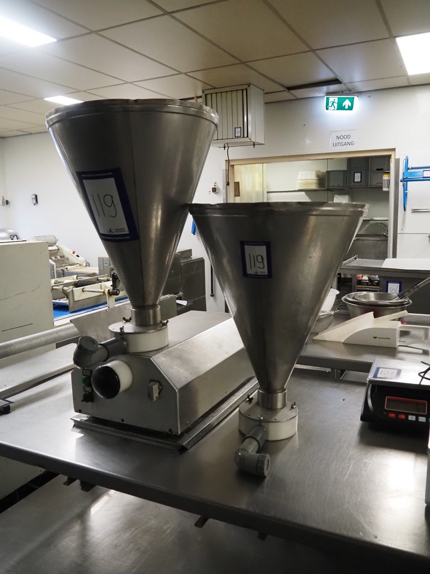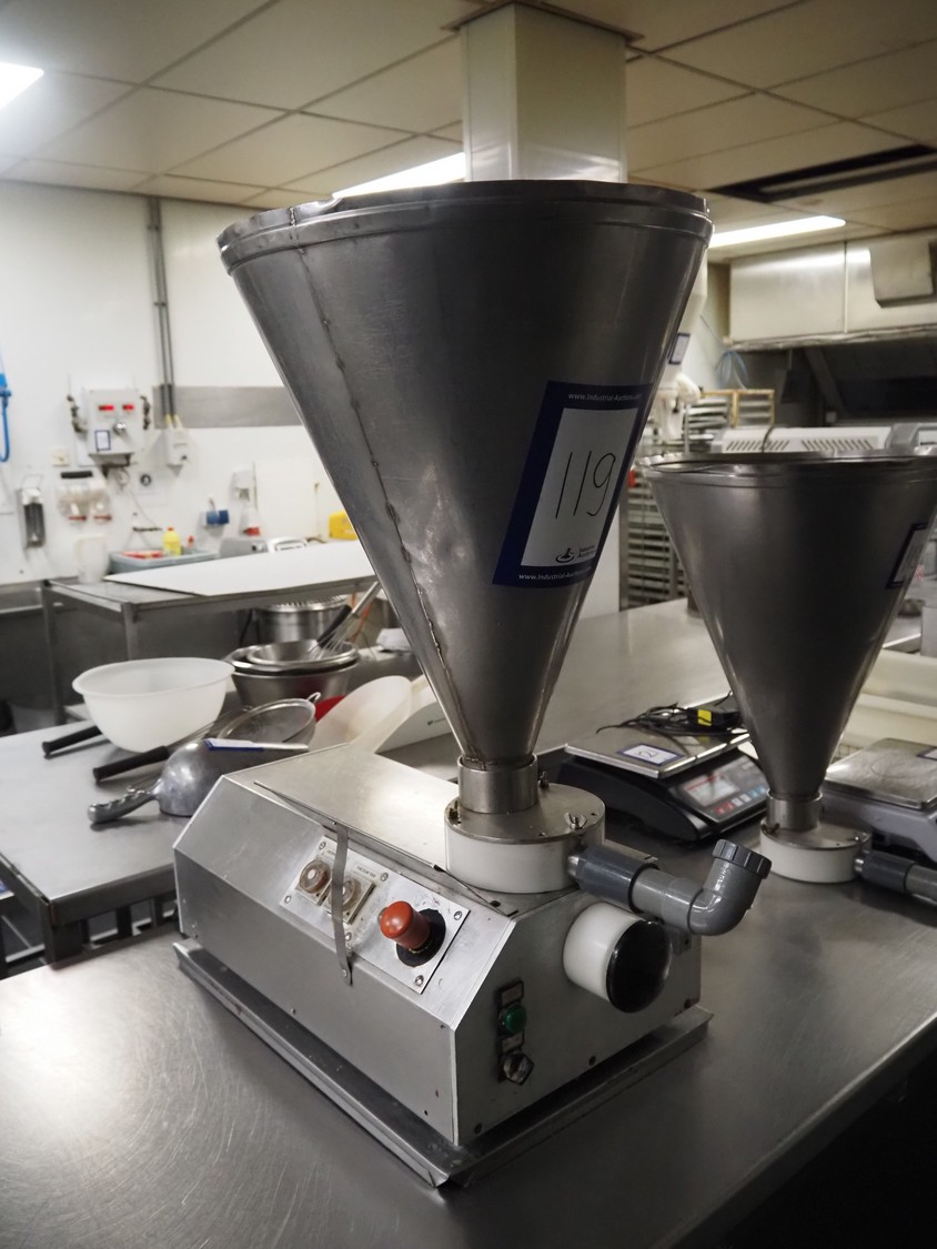 Mimac depositor, model: MDR100-S3, serial number: 034357, year of construction: 2003, 400 V, 50 Hz, funnel: Ø 460 mm x 630 mm, total dimensions: 770 mm x 400 mm x 880 mm. Including extra funnel, dimensions: Ø 470 mm x 635 mm.
