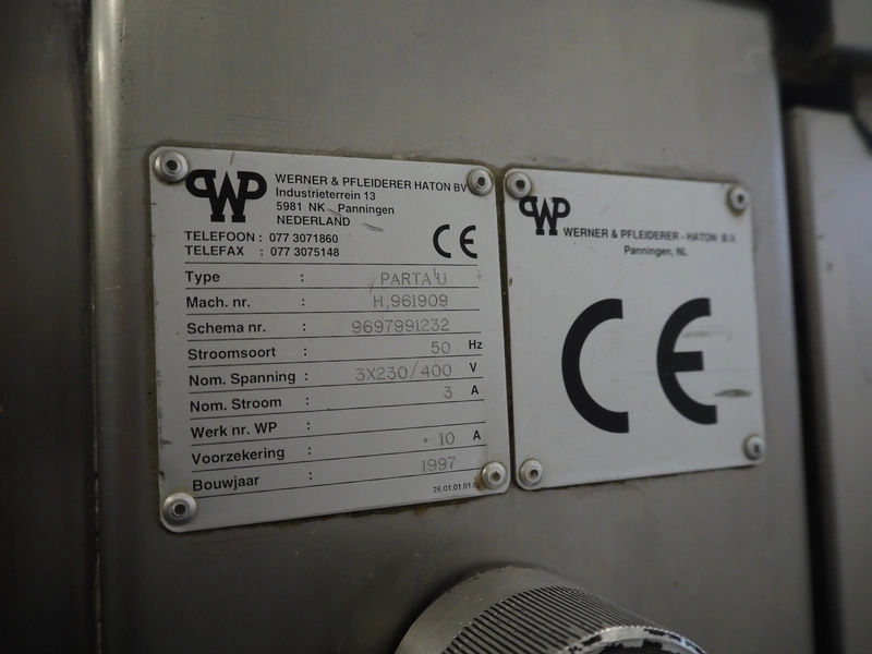 Werner & Pfleiderer Haton BV mobile dough divider, type: PARTA U, machine number: H.961909, year of construction: 1997, 230/400 V, 3 Ph, 50 Hz, 3/10 A, s/s infeed funnel, funnel dimensions: Ø 730 mm x 600 mm, plastic belt, belt width: (2x) 300 mm, total dimensions: 1500 mm x 1100 mm x 1600 mm.
